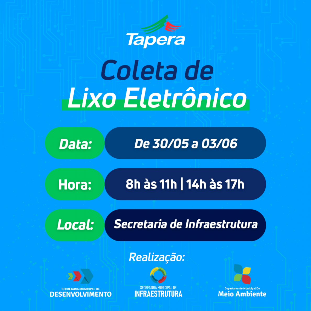 A Prefeitura Municipal de Tapera promoverá coleta de lixo eletrônico, na semana do Meio Ambiente, dos dias 30/05 a 03/06.