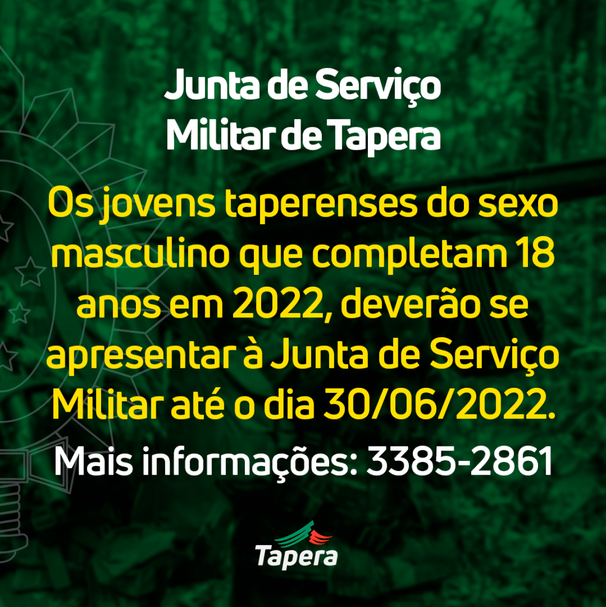 Os jovens taperenses que completam 18 anos em 2022, deveram se apresentar à Junta de Serviço Militar de Tapera, localizada na Rua Duque de Caxias, 349, ao lado da EMATER. O prazo para o alistamento militar é até o dia 30/06/2022, atualmente é possível realizar o alistamento pelo site www.alistamento.eb.mil.br, uma vez que o Exército Brasileiro dispõe da plataforma on-line, no entanto, mesmo que o jovem realize o alistamento pela internet, ele terá que comparecer à Junta Militar para fazer a impressão dos documentos referentes a efetivação odo alistamento, bem como receber as instruções a respeito da data da comissão de seleção.