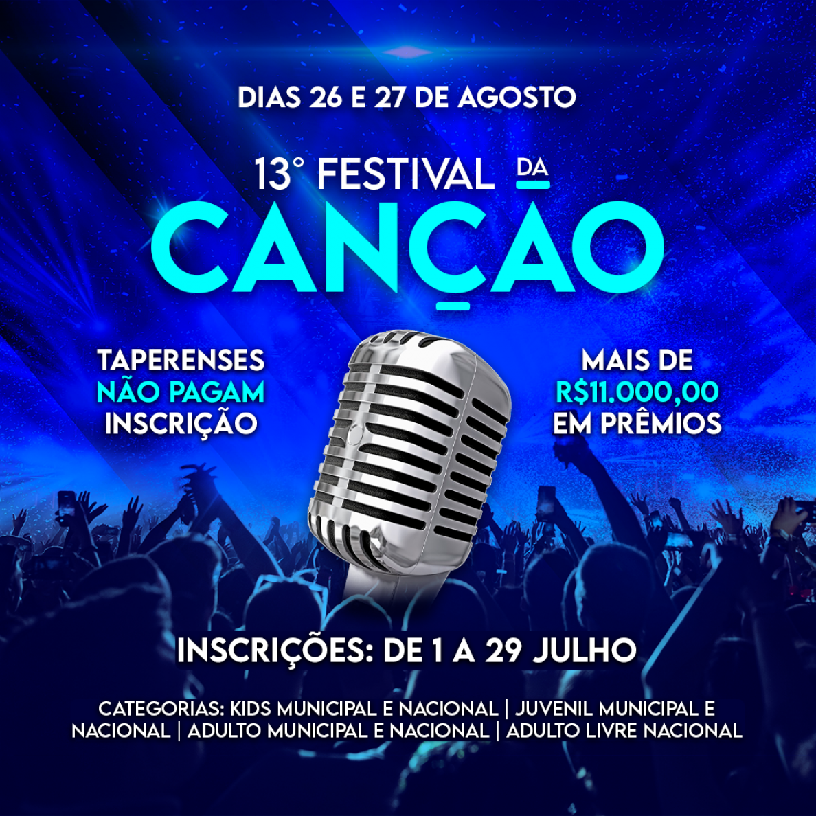 O 13º Festival da Canção será realizado nos dias 26 e 27 de Agosto, no Centro de Eventos do município. Inscrições de 1 a 29 de julho, pelo email: cultura@tapera.rs.gov.br