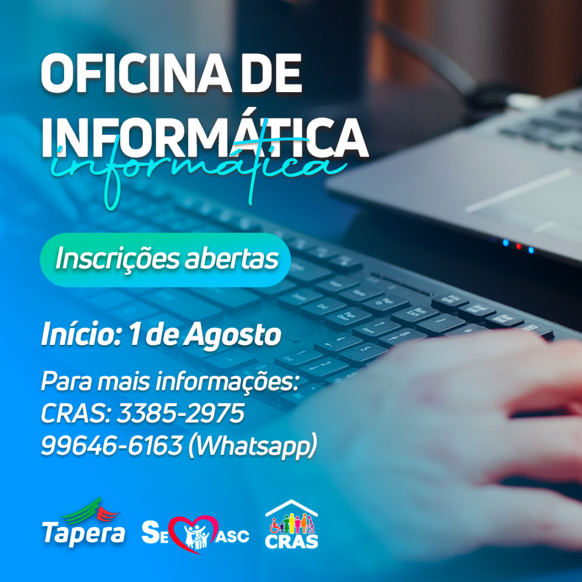 O CRAS, através do Centro de Convivência, convida a todos para se inscreverem na Oficina de Informática que inicia no dia 1 de agosto, participe!