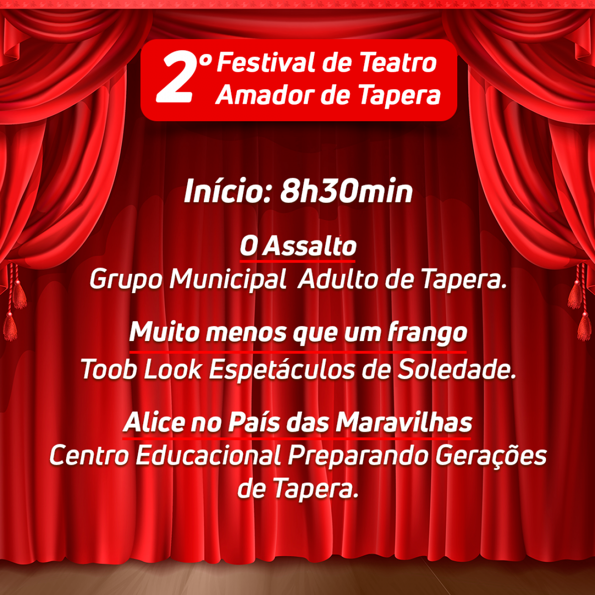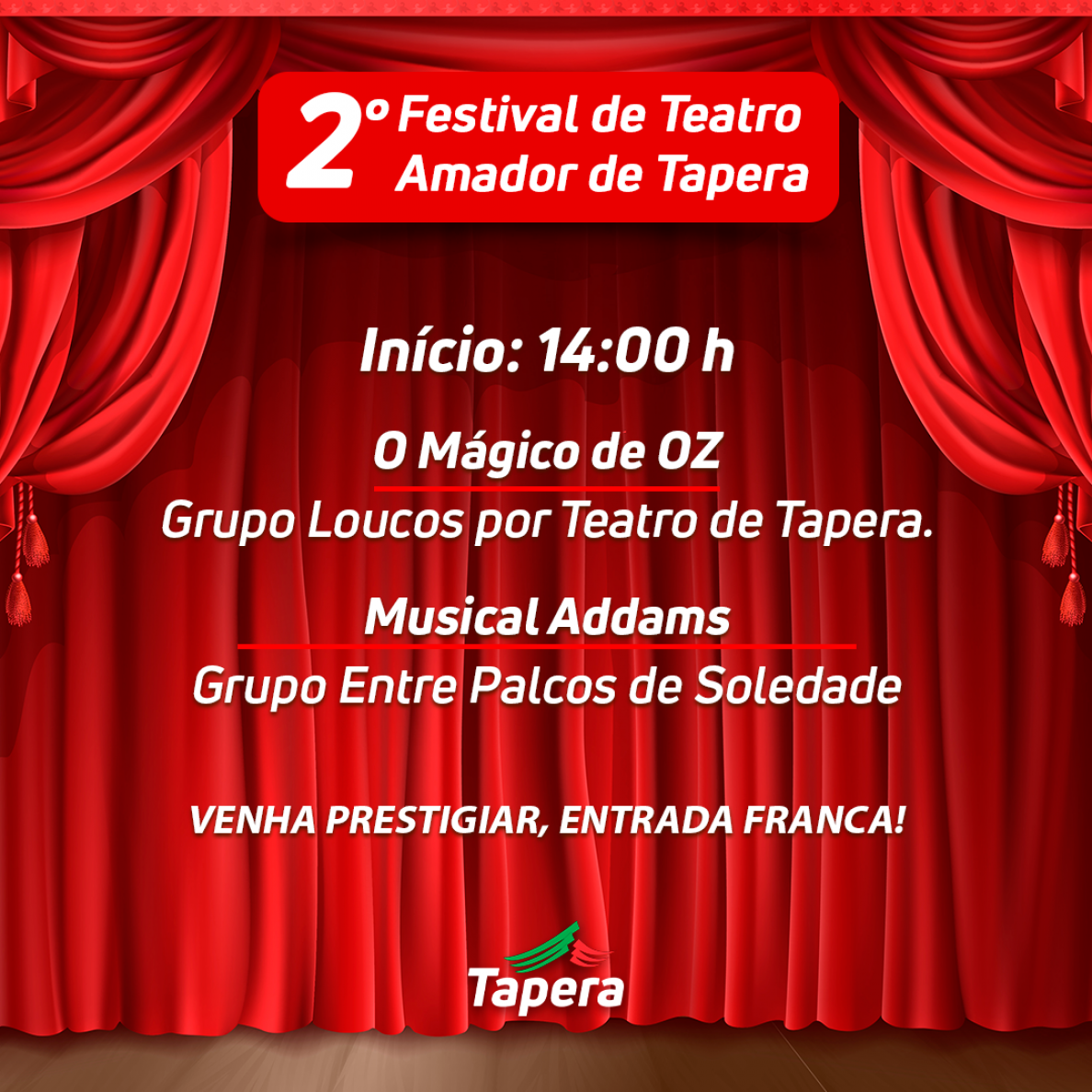 A Secretaria Municipal de Educação, Cultura, Desporto e Lazer, convida a todos para prestigiar o 2° Festival de Teatro Amador de Tapera que irá acontecer no dia 7 de julho no Centro de Eventos do município.
