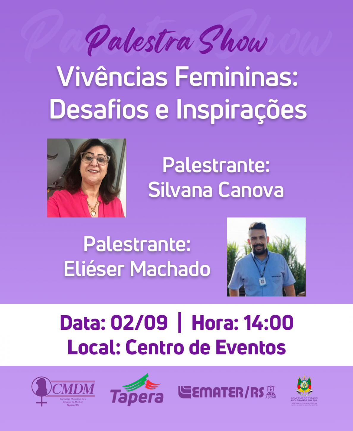 O Conselho Municipal dos Direitos da Mulher de Tapera convida a todos para participar da palestra show, "Vivências Femininas: Desafios e Inspirações", com os palestrantes Silvana Canova e Eliéser Machado.