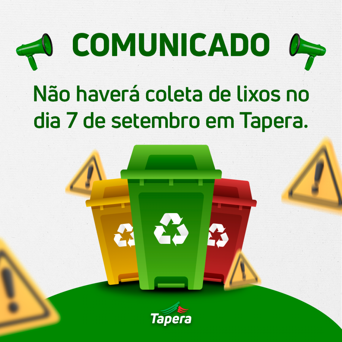 A empresa ECOSUL informa que não haverá coleta de lixos no dia 7 de setembro em Tapera, retornando normalmente dia 8.