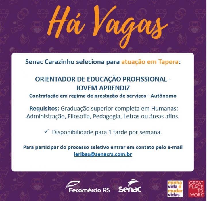 Senac Carazinho seleciona ORIENTADOR DE EDUCAÇÃO PROFISSIONAL - JOVEM APRENDIZ para atuação em Tapera