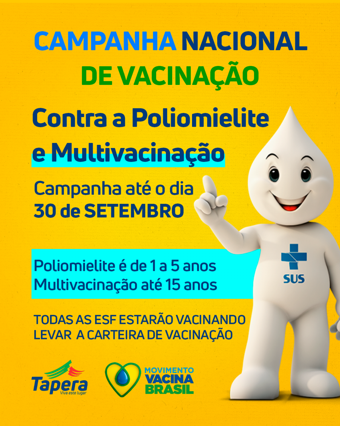 Até o dia 30 de SETEMBRO, todas as ESF do município estarão vacinando contra Poliomielite e Multivacinação para atualização da carteira de vacinação da criança e adolescente.