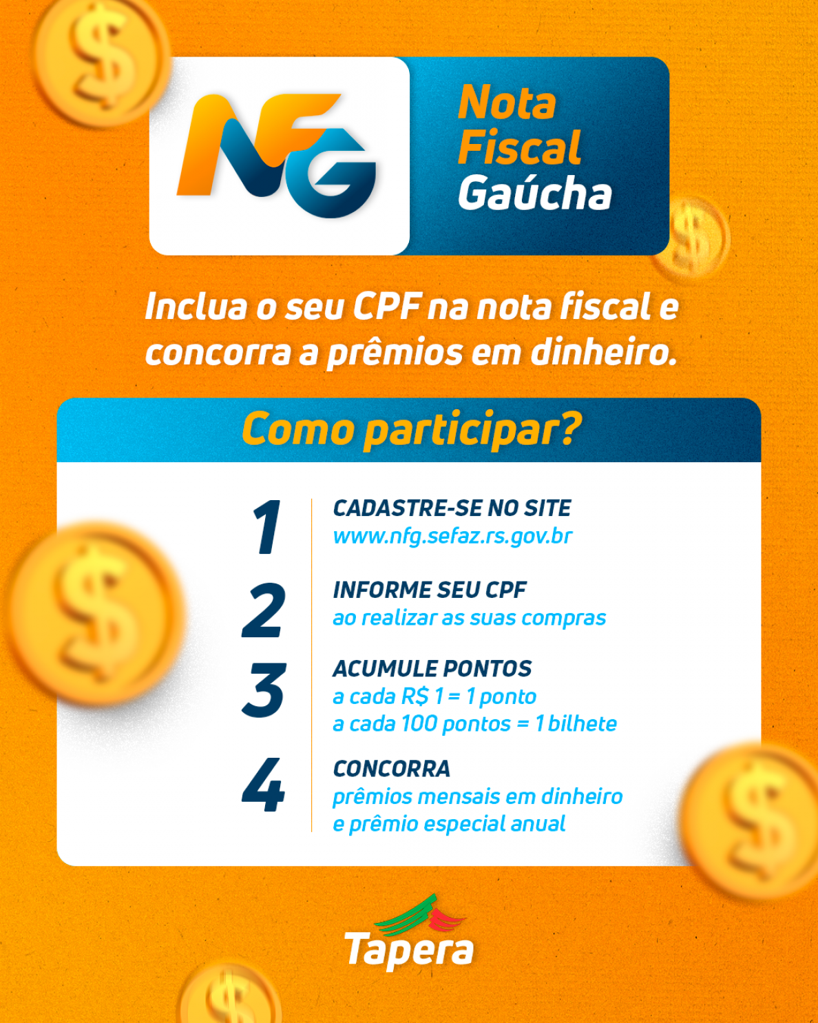 Além de concorrer a prêmios estaduais e municipais em dinheiro, pode ganhar desconto no IPVA e escolher entidades sociais para receber repasses do Estado. Para concorrer aos prêmios em dinheiro, basta solicitar a inclusão do CPF na nota ou cupom fiscal e cadastrar-se no Programa através do site: www.notafiscalgaucha.rs.gov.br