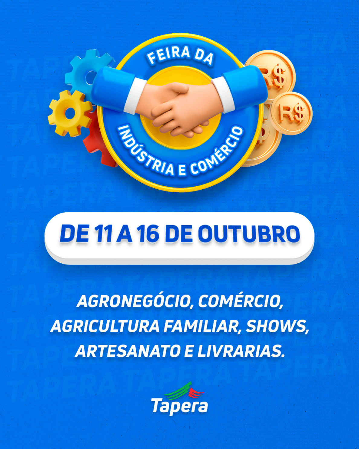 Vem aí mais um evento no mês de Outubro para Tapera e região, a Feira da Indústria e Comércio, com stands de agronegócio, comércio em geral, agricultura familiar, artesanato, livrarias, shows e brinquedos infantis. Venha prestigiar!