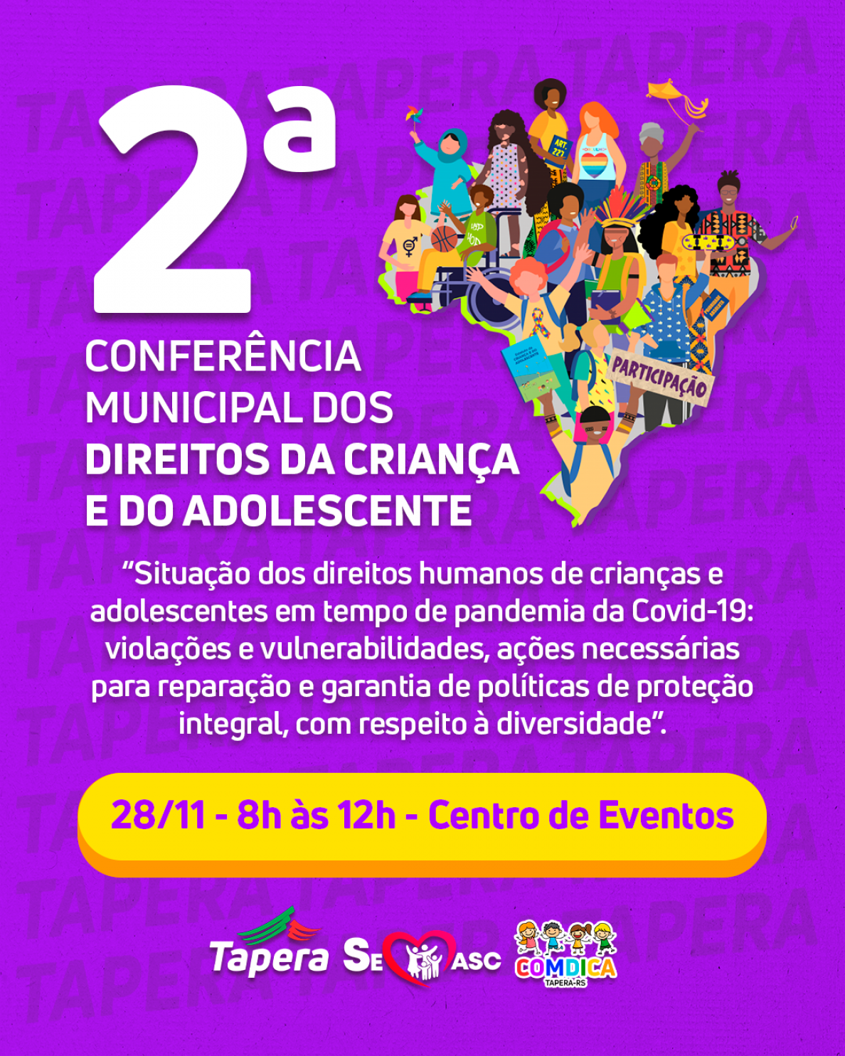 O Conselho Municipal dos Direitos da Criança e do Adolescente - COMDICA, com o apoio da Administração Municipal, irá realizar a 2ª Conferência Municipal dos Direitos da Crianças e do Adolescente, que tem como tema geral: “A situação dos direitos humanos de crianças e adolescentes em tempos de pandemia de COVID-19: violações e vulnerabilidades, ações necessárias para reparação e garantia de políticas de proteção integral, com respeito à diversidade.”