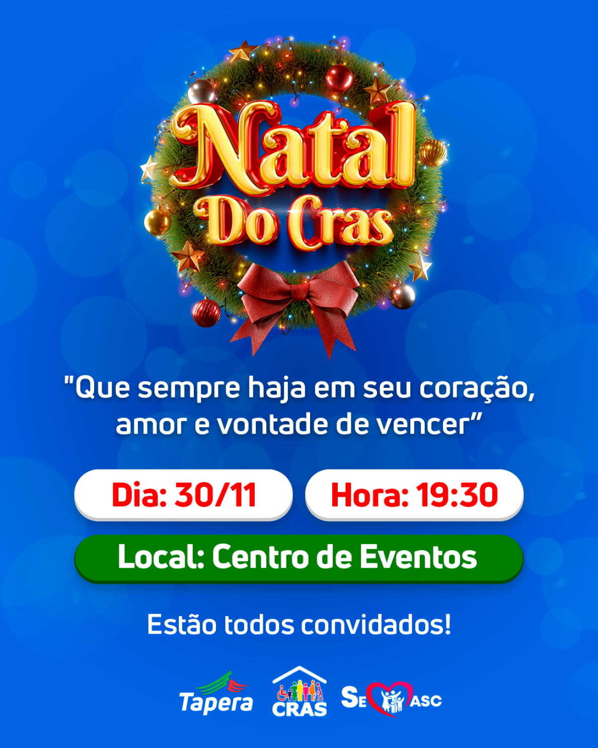 Dia 30 de novembro, às 19h30min, ocorrerá no Centro de Eventos o Natal do Cras. Você e sua família estão convidados para prestigiar esse lindo espetáculo de Natal.