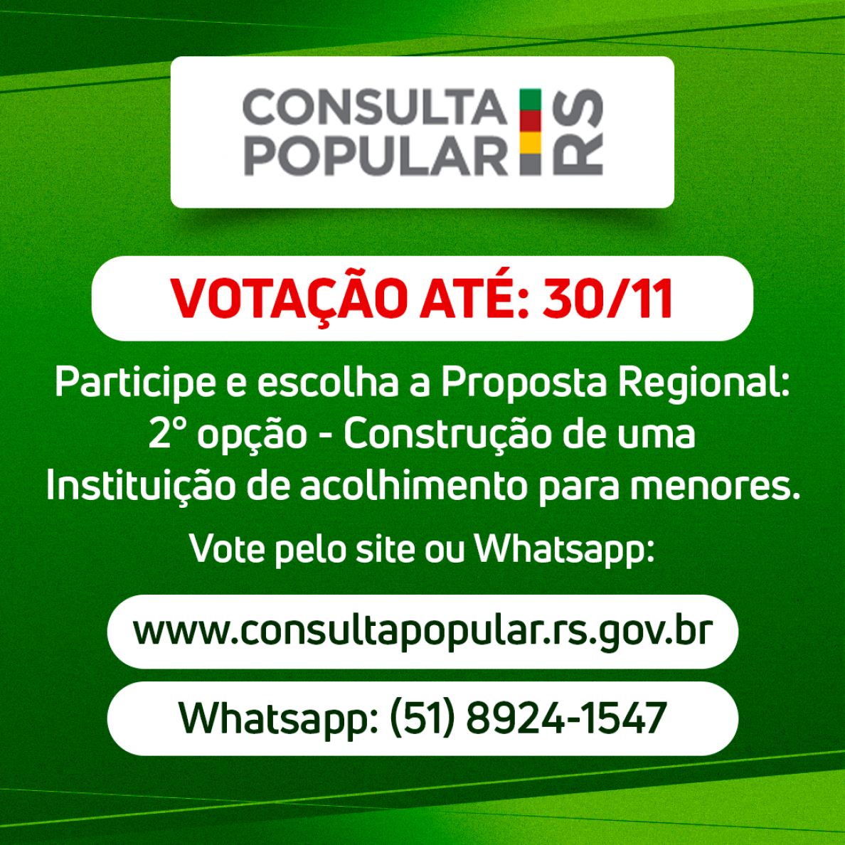 A votação popular para a Consulta Popular 2022 vai até AMANHÃ, 23 de novembro. Contamos com a colaboração e participação de todos os cidadãos para a escolha da Proposta Regional: 2° opção - Construção de uma Instituição de acolhimento para menores. Para votar, tenha o número do título de eleitor em mãos.
