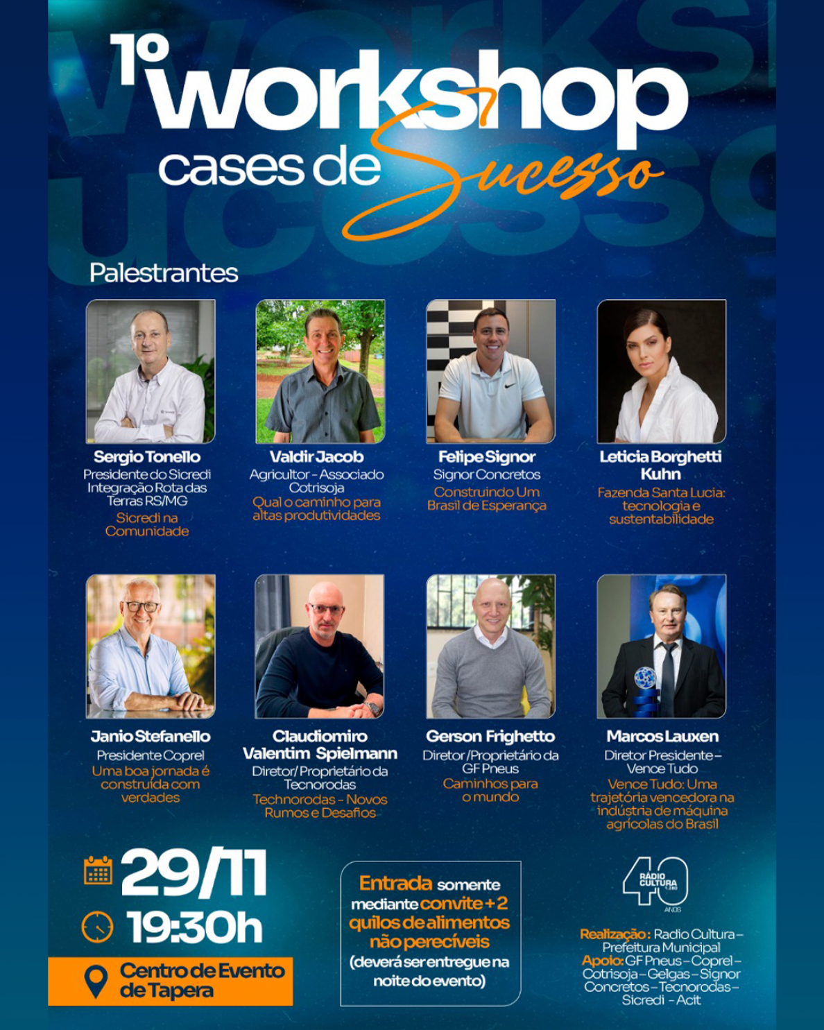Hoje à noite, no Centro de Eventos irá ocorrer o 1º Workshop - Cases de Sucesso, o qual contará com a presenças de empresários de Tapera e região que irão palestrar sobre diferentes assuntos.