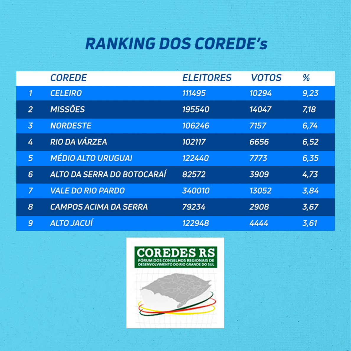 O governo do Estado divulgou os resultados finais da Consulta Popular 2022/2023. A região do Alto Jacuí entrou no top 9 dos COREDE’s (Conselhos Regionais de Desenvolvimento) e com isso conseguiu recursos para duas propostas regionais, as mais votadas foram:
