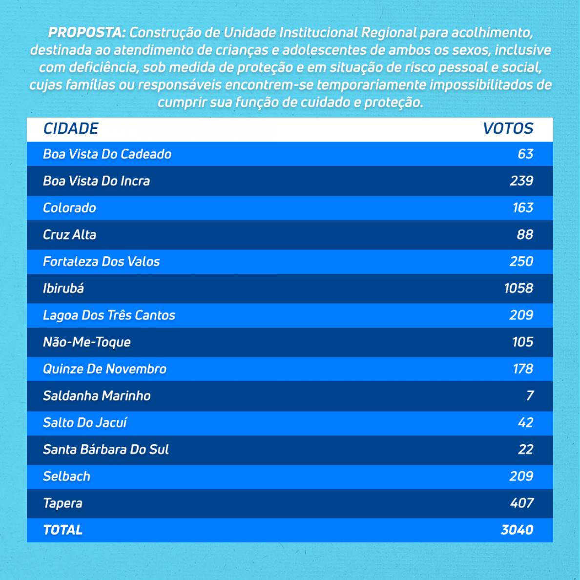 Proposta 1: Construção de Unidade Institucional Regional para acolhimento, destinada ao atendimento de crianças e adolescentes de ambos os sexos, inclusive crianças e adolescentes com deficiência, sob medida de proteção (Art. 98 do Estatuto da Criança e do Adolescente) e em situação de risco pessoal e social, cujas famílias ou responsáveis encontrem-se temporariamente impossibilitados de cumprir sua função de cuidado e proteção, tendo em vista a região do Alto Jacuí/ AMAJA não dispor de instituições nesta modalidade para atendimento de suas demandas.