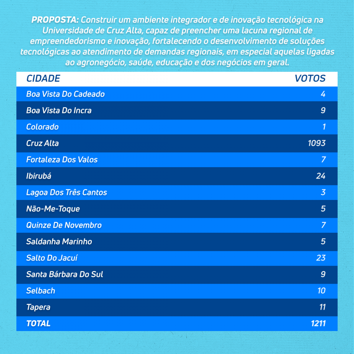 Proposta 2: Construir um ambiente integrador e de inovação tecnológica na Universidade de Cruz Alta, capaz de preencher uma lacuna regional de empreendedorismo e inovação, fortalecendo o desenvolvimento de soluções tecnológicas ao atendimento de demandas regionais, em especial aquelas ligadas ao agronegócio, saúde, educação e dos negócios em geral.