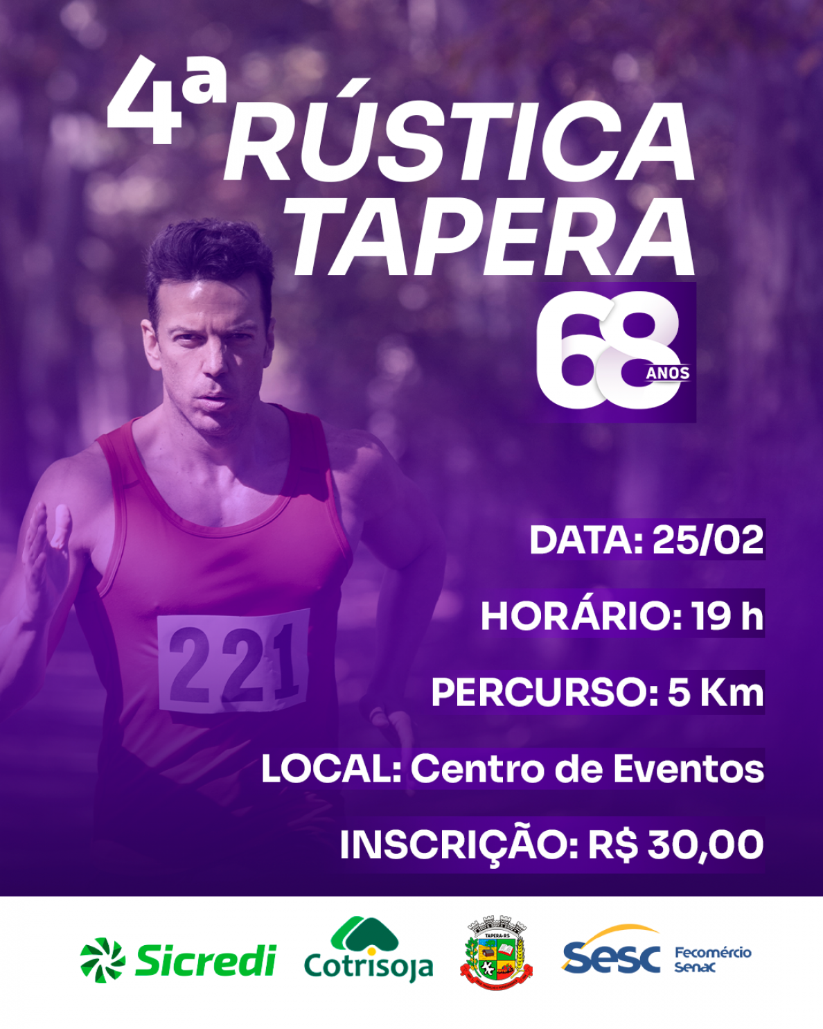 Dia 25 de fevereiro, às 19 horas, em frente ao Centro de Eventos, irá ocorrer a 4ª Rústica de Tapera de 5 Km. O evento é em comemoração ao 68º aniversário da nossa querida cidade e contará com a participação de diversos atletas da região e do estado, participe você também!
