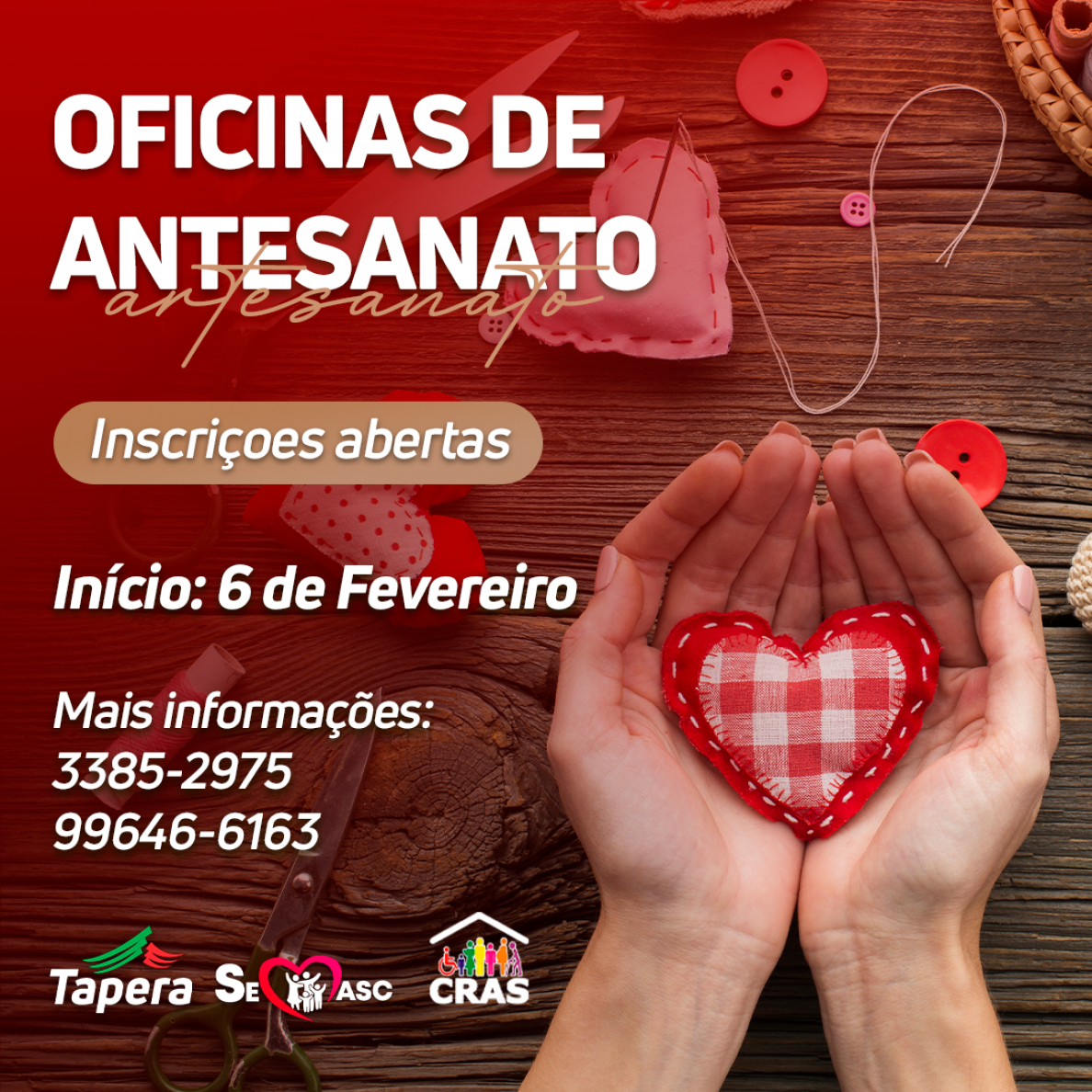 A Secretaria Municipal de Assistência Social e Cidadania de Tapera, comunica que as OFICINAS DE ARTESANATO têm inscrições abertas.