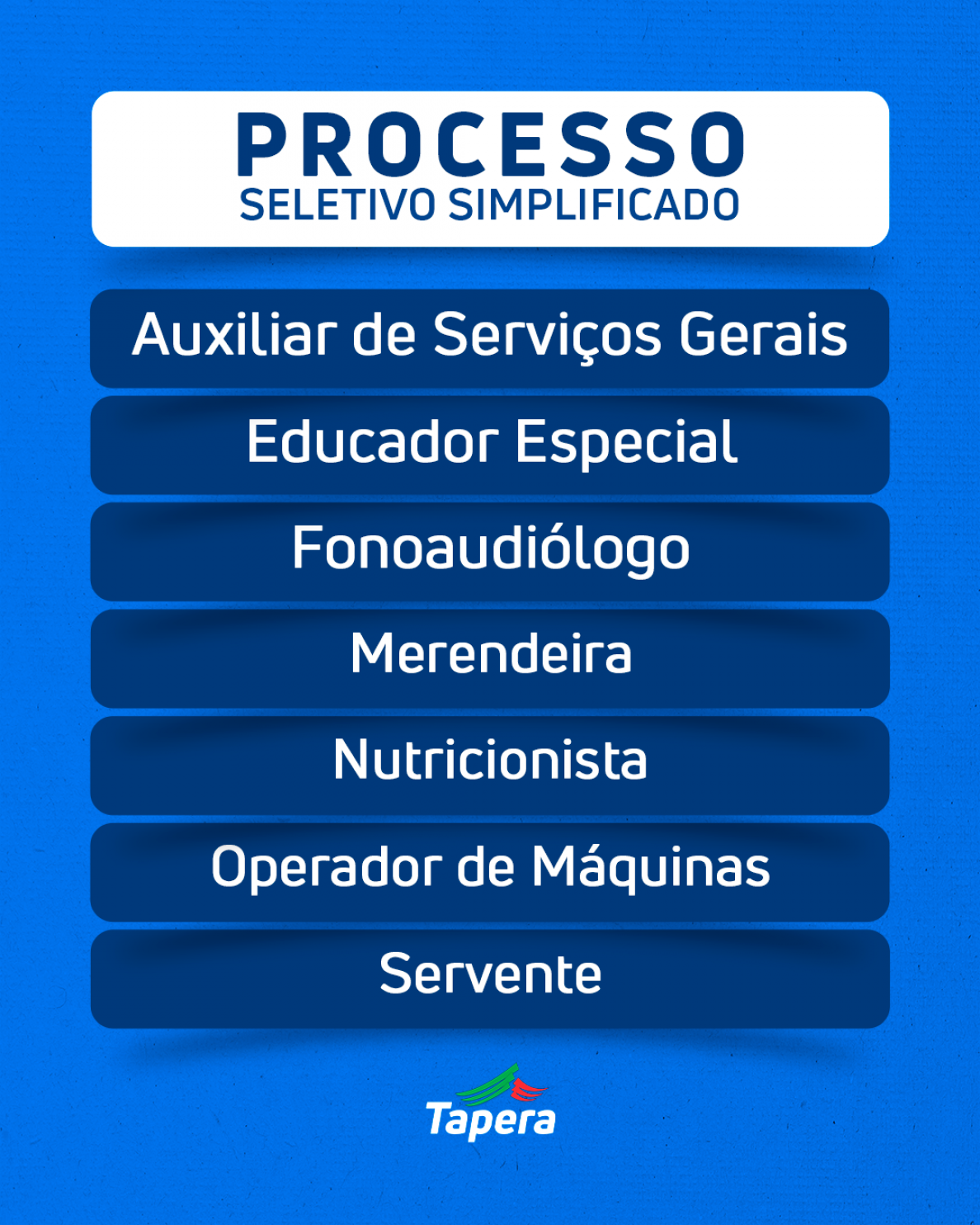 Abertas as incrições para as vagas de: Auxiliar de Serviços Gerais, Educador(a) Especial, Fonoaudiólogo(a), Merendeira, Nutricionista, Operador de Máquinas e Servente.