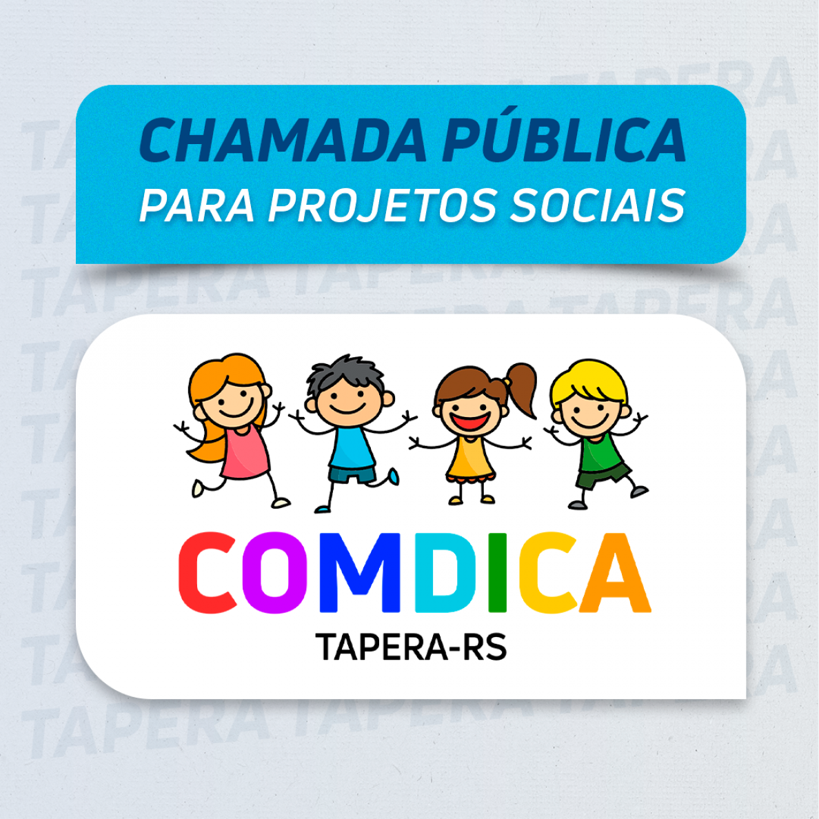 O CONSELHO MUNICIPAL DOS DIREITOS DA CRIANÇA E DO ADOLESCENTE – COMDICA/Tapera, no uso das atribuições legais que lhe confere a Lei Municipal nº. 3.090, de 22 de abril de 2015, torna público a chamada para Projetos Sociais a serem executados no ano base de 2023, com recursos oriundos do Fundo Municipal dos Direitos da Criança e do Adolescente – FUNDICA, para a viabilização de projetos voltados ao atendimento de crianças e adolescentes.