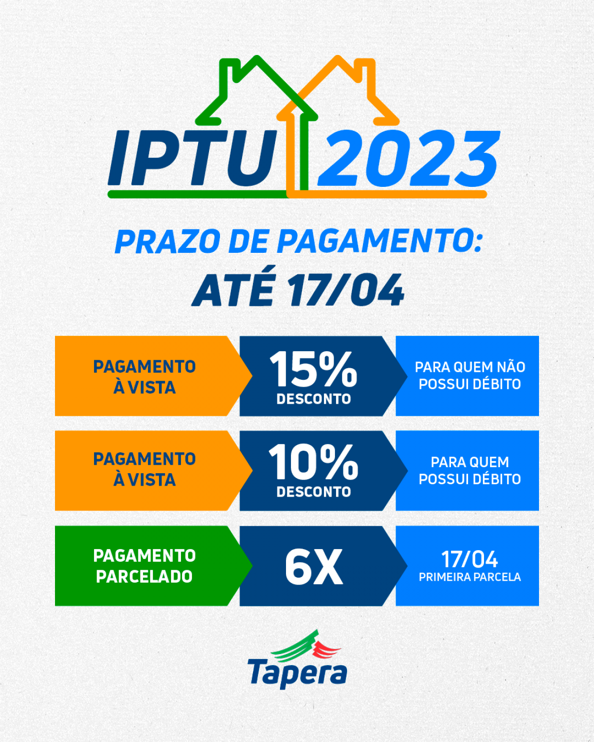 O vencimento do IPTU será em 17/04. O contribuinte taperense poderá optar por pagamento em cota única, com 15% de desconto para quem não possui débitos e 10% para os que possuem débitos, ou ainda parcelamento em 6x, sendo o vencimento da primeira parcela no dia 17/04.