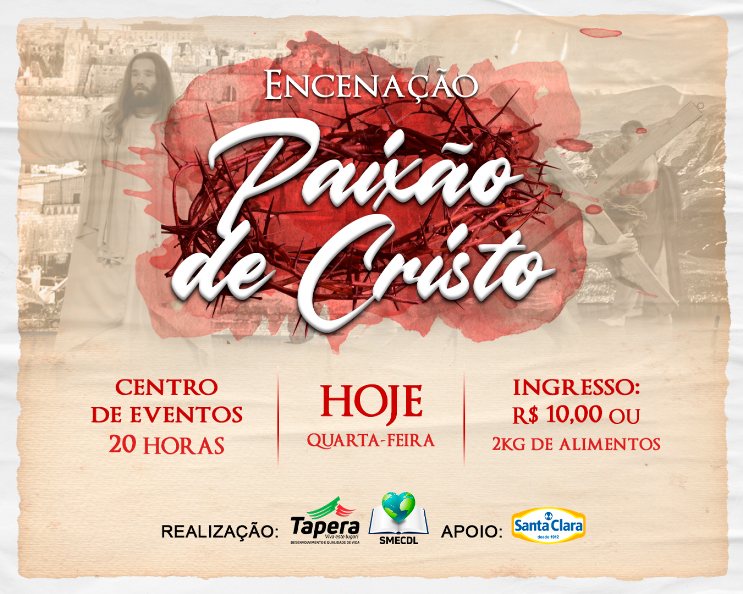 A Prefeitura Municipal de Tapera tem o prazer de convidar a todos para prestigiarem a tradicional encenação, Paixão de Cristo, que irá se realizar dia 5 de abril, no Centro de Eventos.