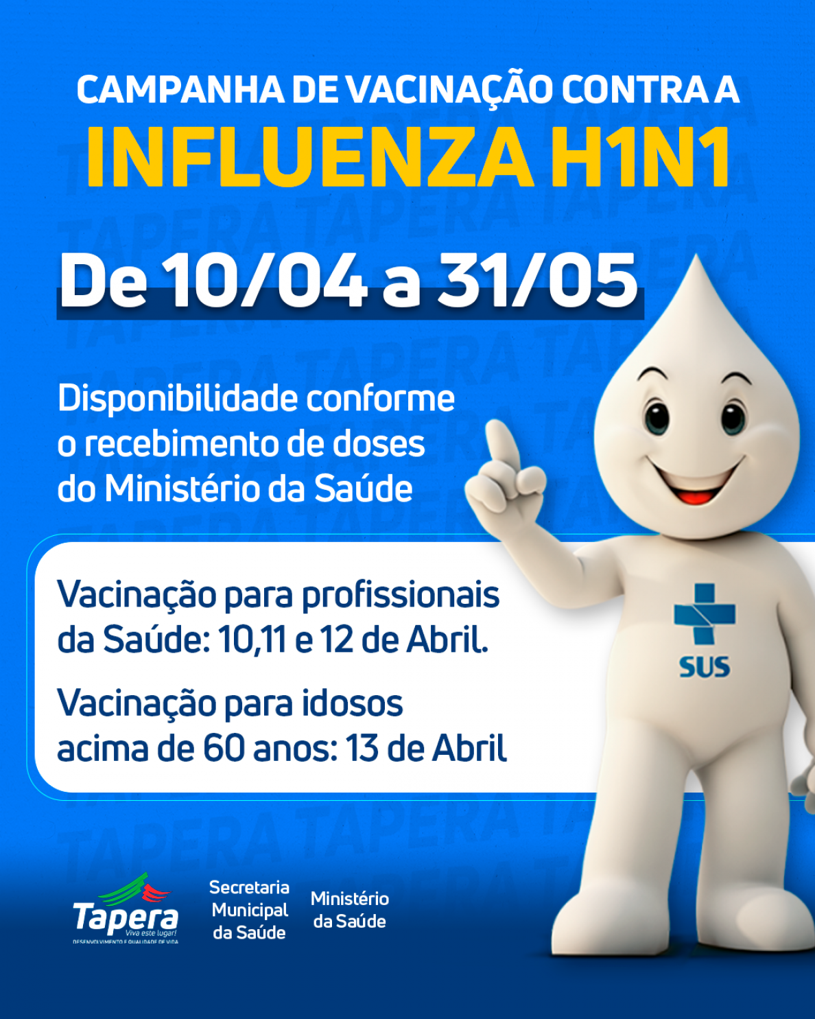 A Secretaria Municipal da Saúde, informa a todos que do dia 10 de abril a 31 de maio irá realizar a campanha de vacinação contra a Influenza H1N1. O município irá disponibilizar a vacinação conforme for recebendo doses do Ministério da Saúde.