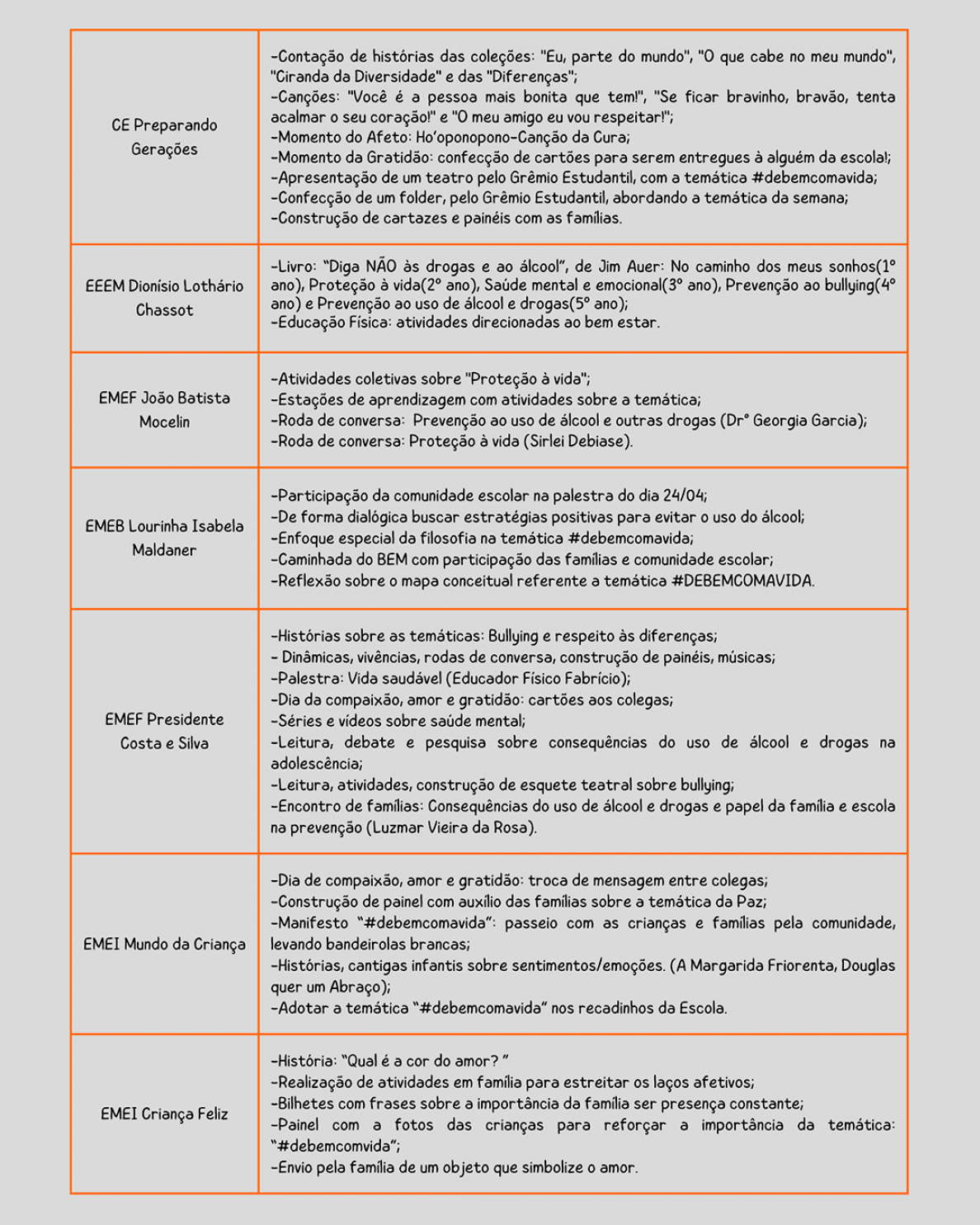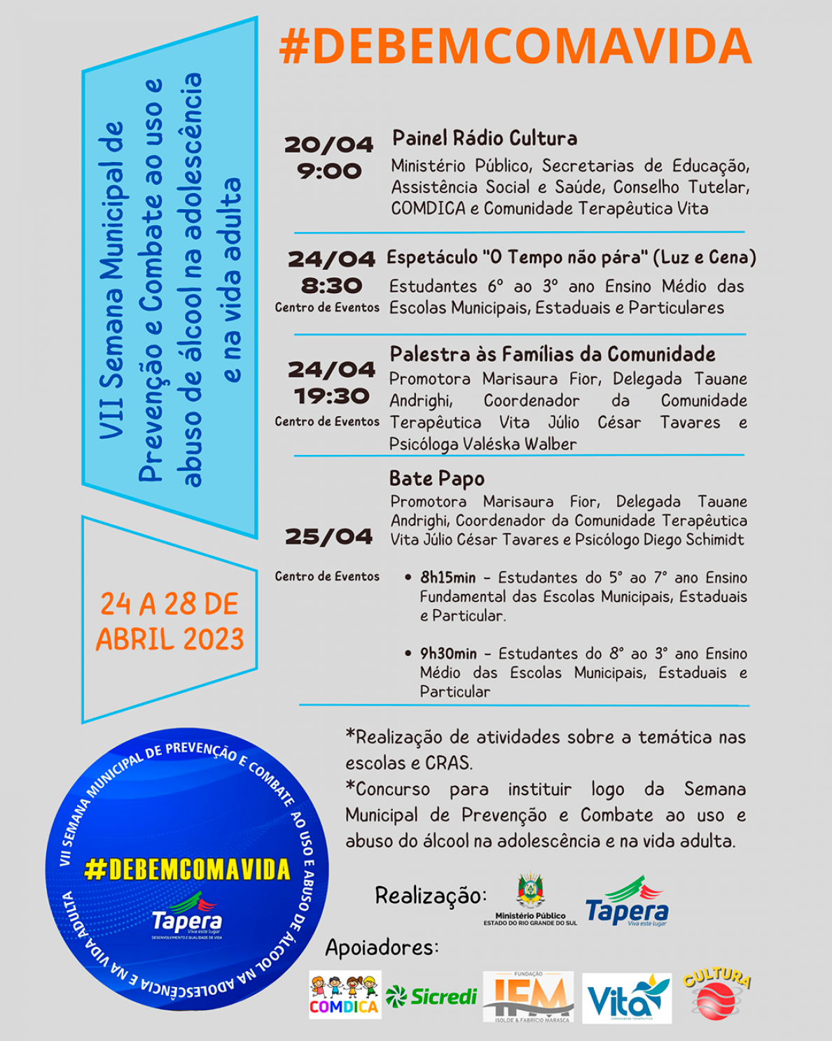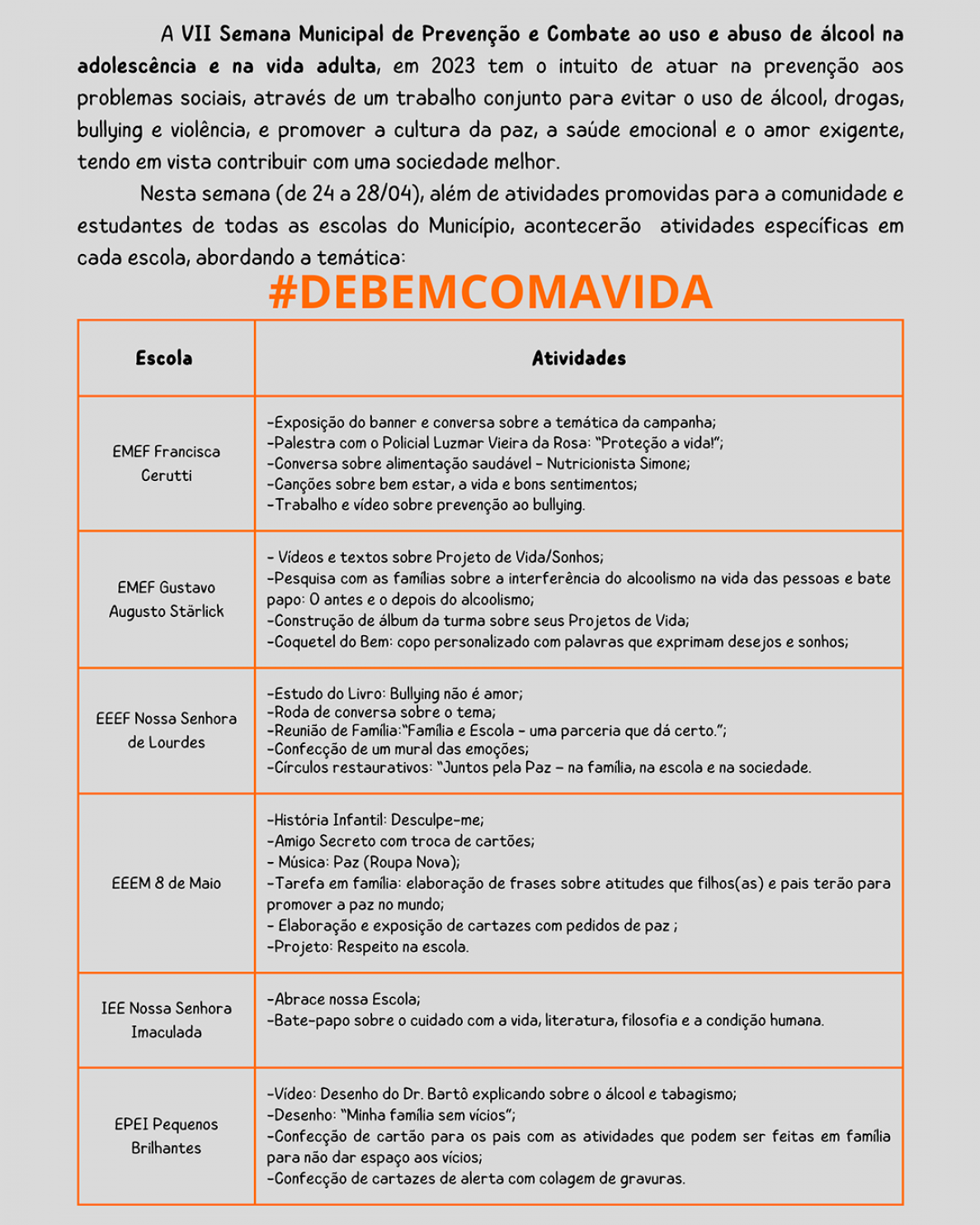 A VII SEMANA MUNICIPAL DE PREVENÇÃO E COMBATE AO USO E ABUSO DE ÁLCOOL NA ADOLESCÊNCIA E NA VIDA ADULTA, tem o intuito de atuar na prevenção aos problemas sociais, através de um trabalho conjunto para evitar o uso de álcool, drogas, além do bullying e a violência, promovendo uma cultura de paz, saúde emocional e amor exigente, tendo em vista contribuir com uma sociedade melhor. Na próxima semana, de 24 a 28/04, além de atividades promovidas para a comunidade e estudantes de todas as escolas do município, acontecerão atividades específicas em cada escola, abordando a temática: #DEBEMCOMAVIDA Realização: Prefeitura Municipal, através da Secretária de Educação em parceria com o Ministério Público do Estado Apoio: Comdica, Fundação Isolde e Fabrício Marasca, Vita Comunidade Terapêutica, Sicredi e Rádio Cultura.