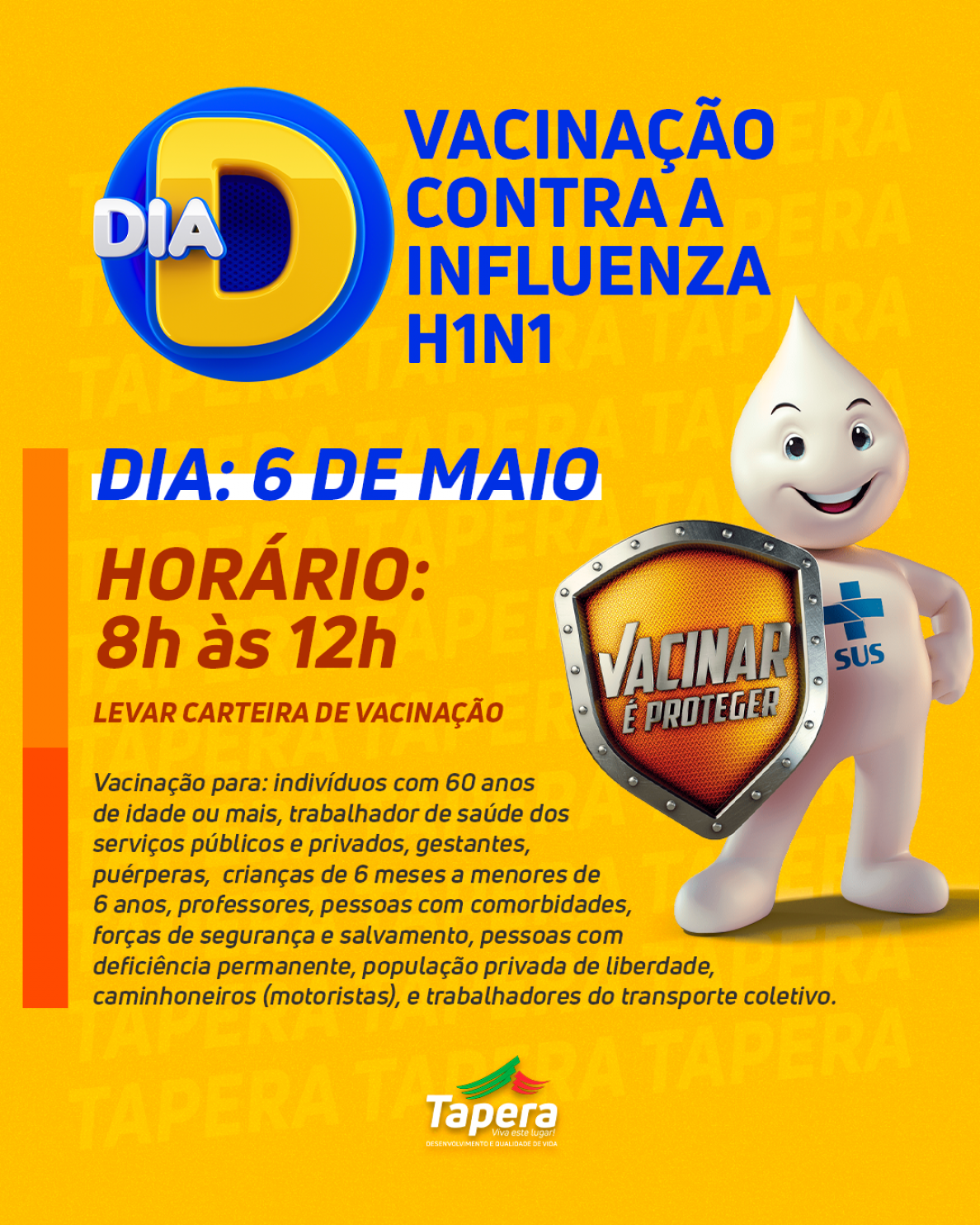Vacinação para: indivíduos com 60 anos de idade ou mais, trabalhador de saúde dos serviços públicos e privados, gestantes, puérperas, crianças de 6 meses a menores de 6 anos, professores, pessoas com comorbidades, forças de segurança e salvamento, pessoas com deficiência permanente, população privada de liberdade, caminhoneiros (motoristas),trabalhadores do transporte coletivo.