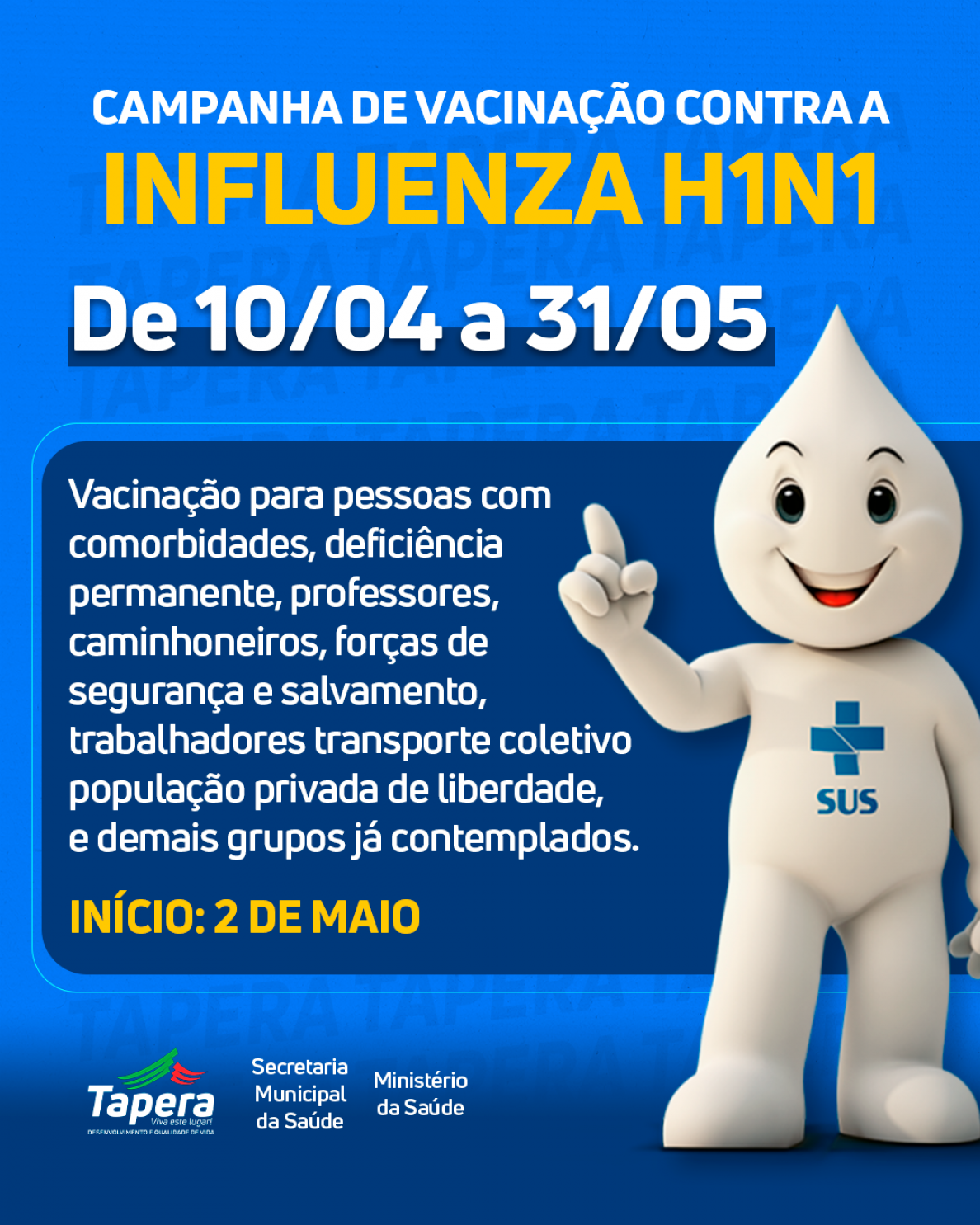 A vacinação para pessoas com comorbidades, deficiência permanente, professores, caminhoneiros, forças de segurança e salvamento, trabalhadores transporte coletivo, população privada de liberdade, e demais grupos já contemplados, inicia amanhã, 2 de maio. A Secretaria Municipal da Saúde, informa a todos que até o dia 31 de maio irá realizar a campanha de vacinação contra a Influenza H1N1. O município irá disponibilizar a vacinação conforme for recebendo doses do Ministério da Saúde. Todas as unidades de saúde estarão vacinando, apresente sua carteira de vacinação.