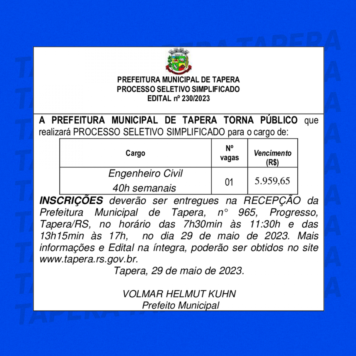 Inscrições para o processo seletivo simplificado de Engenheiro Civil, até o dia 29 de maio às 17h.Editais: CLIQUE AQUIou para mais informaçõs ligue: 3385-3300.