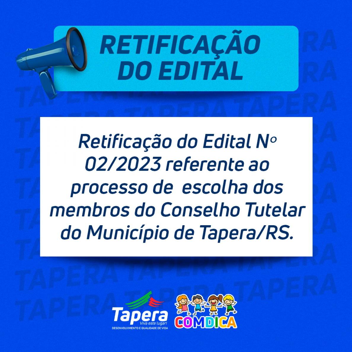 O COMDICA - Conselho Municipal dos Direitos da Criança e do Adolescente através da Comissão Especial, TORNA PÚBLICA a Retificação do Edital n. 02/2023 referente ao processo de escolha dos membros do Conselho Tutelar do Município de Tapera/RS.