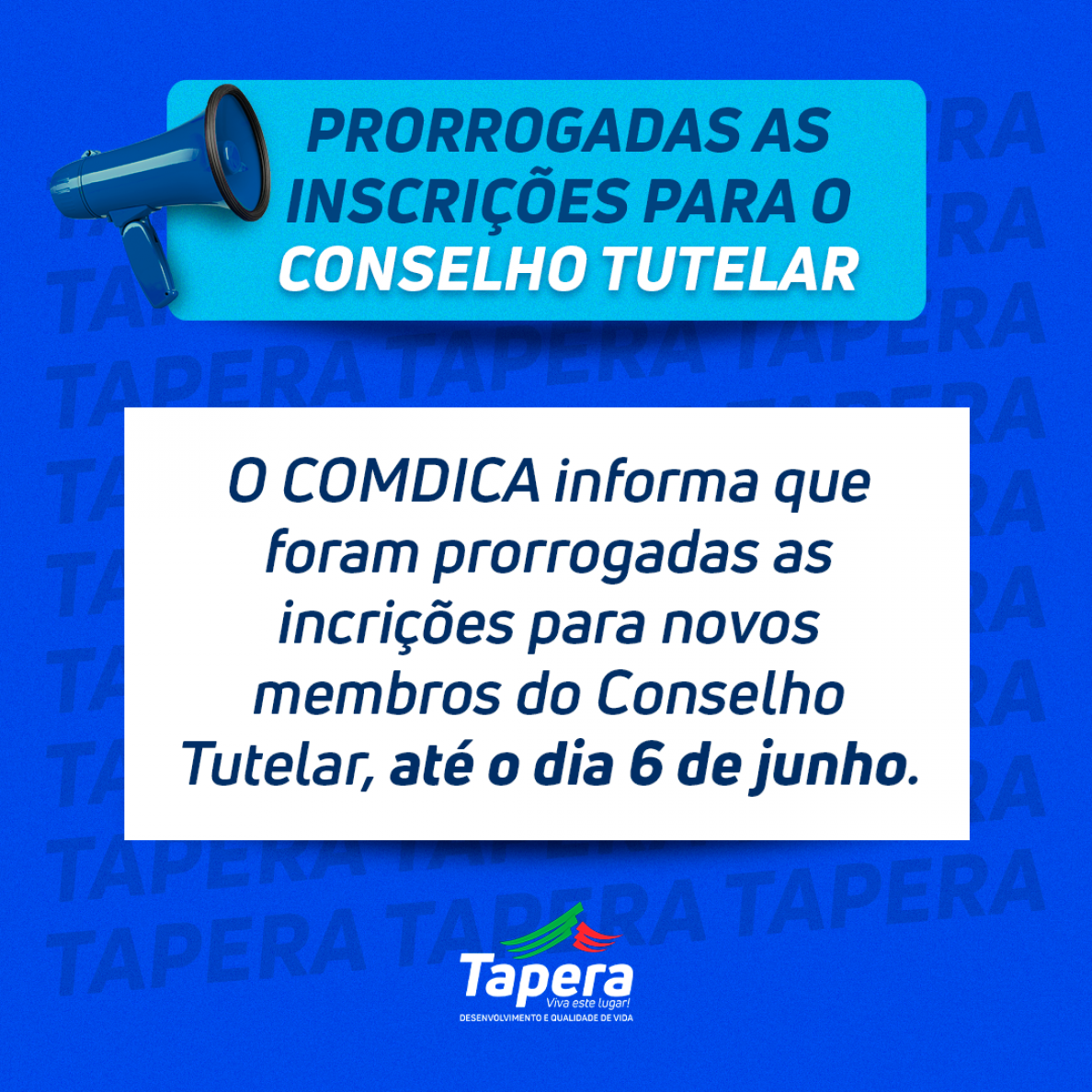 O COMDICA informa que foram prorrogadas as incrições para novos membros do Conselho Tutelar, até o dia 6 de junho.