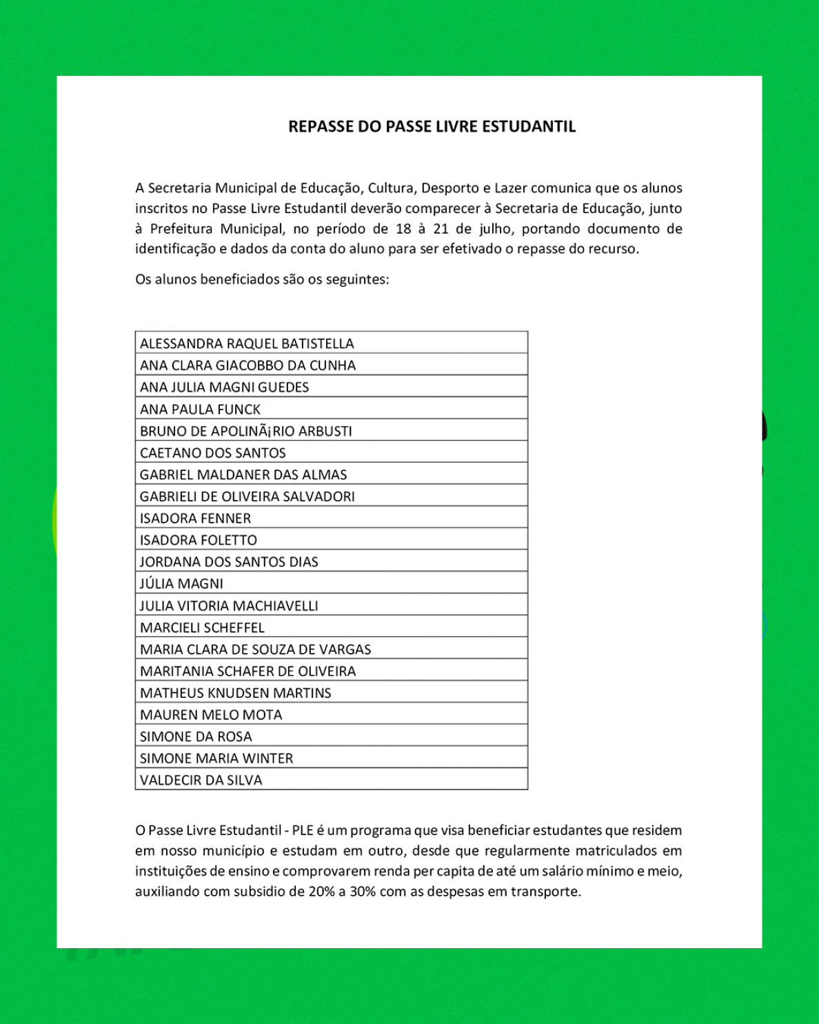 A Secretaria Municipal de Educação, Cultura, Desporto e Lazer comunica que os alunos inscritos no Passe Livre Estudantil deverão comparecer à Secretaria de Educação, junto à Prefeitura Municipal, no período de 18 à 21 de julho, portando documento de identificação e dados da conta do aluno para ser efetivado o repasse do recurso.