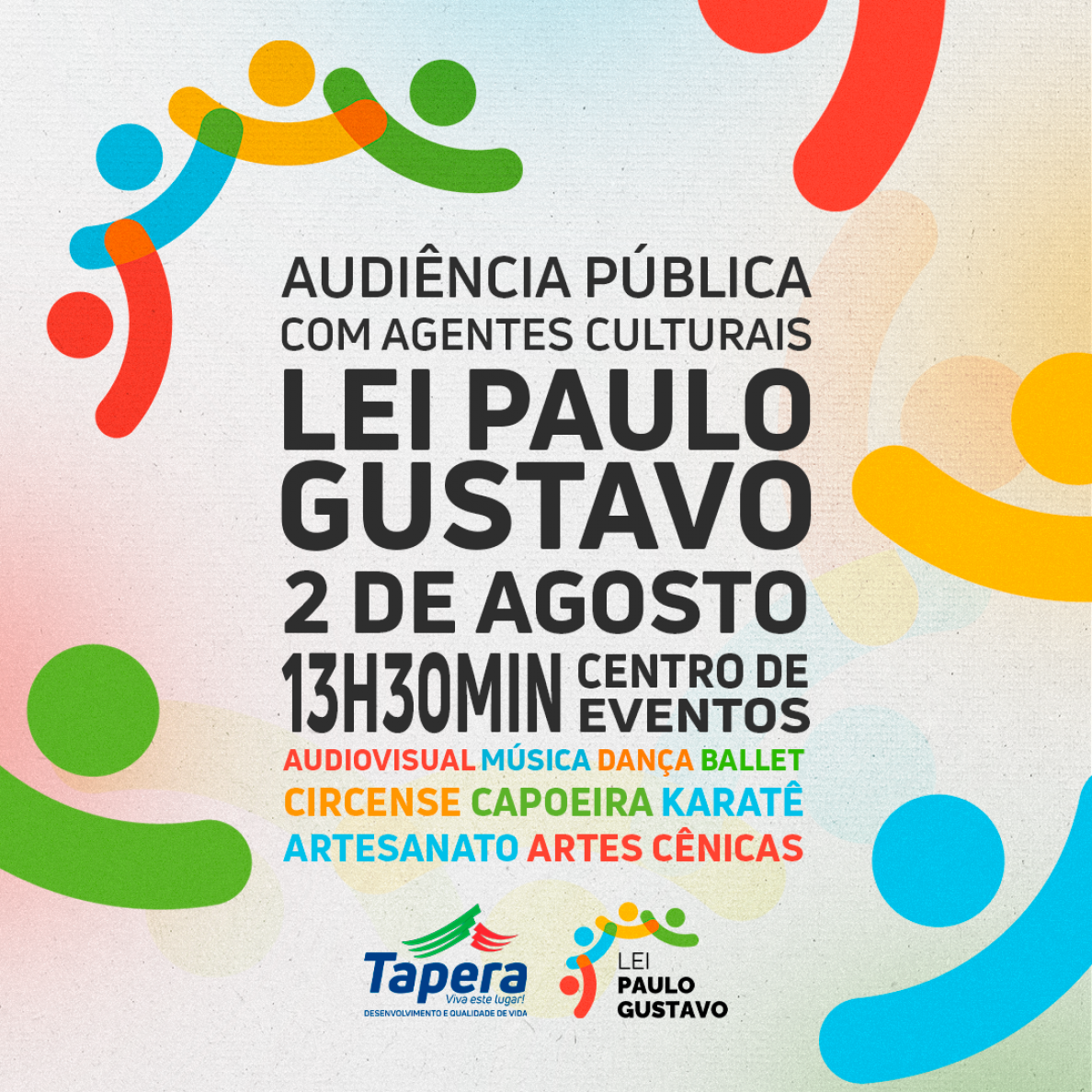 Audiência Pública LEI PAULO GUSTAVO, com Agentes Culturais, quarta-feira, 2 de agosto, às 13h30min, no Centro de Eventos de Tapera.