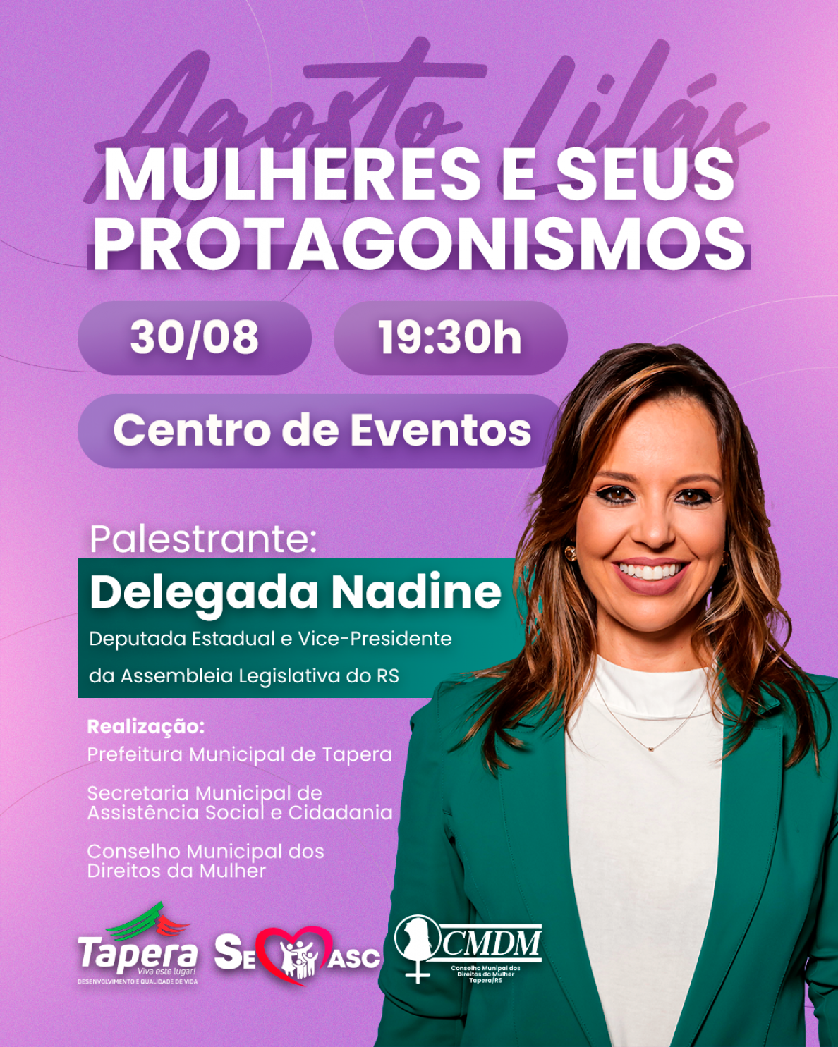 A Secretária Municipal de Assistência Social e Cidadania, em parceria com o Conselho Municipal dos Direitos da Mulher, convidam a todas as mulheres para palestra “Mulheres e seus protagonismos”, que acontecerá dia 30 de agosto, às 19h30min, no Centro de Eventos de Tapera.