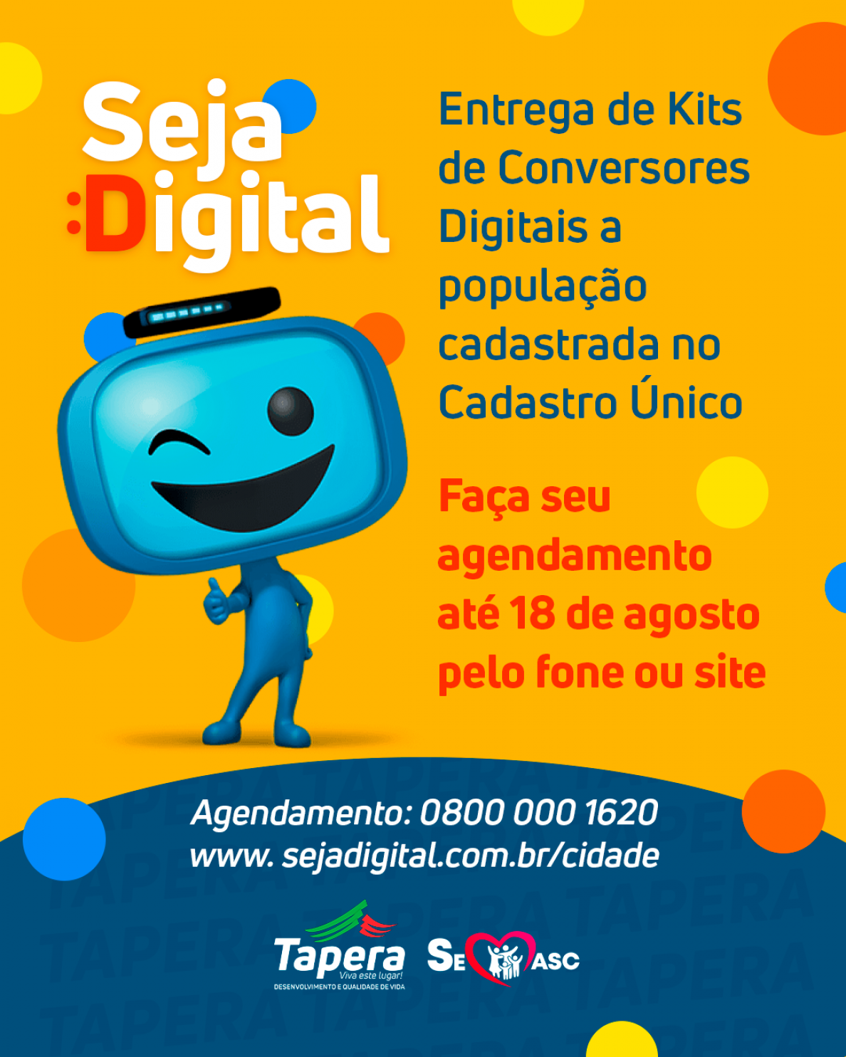 A Prefeitura Municipal de Tapera, através da Secretaria Municipal de Assistência Social e Cidadania, em parceria com a Instituição não governamental, Seja Digital, estará realizando a entrega de Kits de Conversores Digitais a população que está cadastrada no Cadastro Único até 31/07/2022.