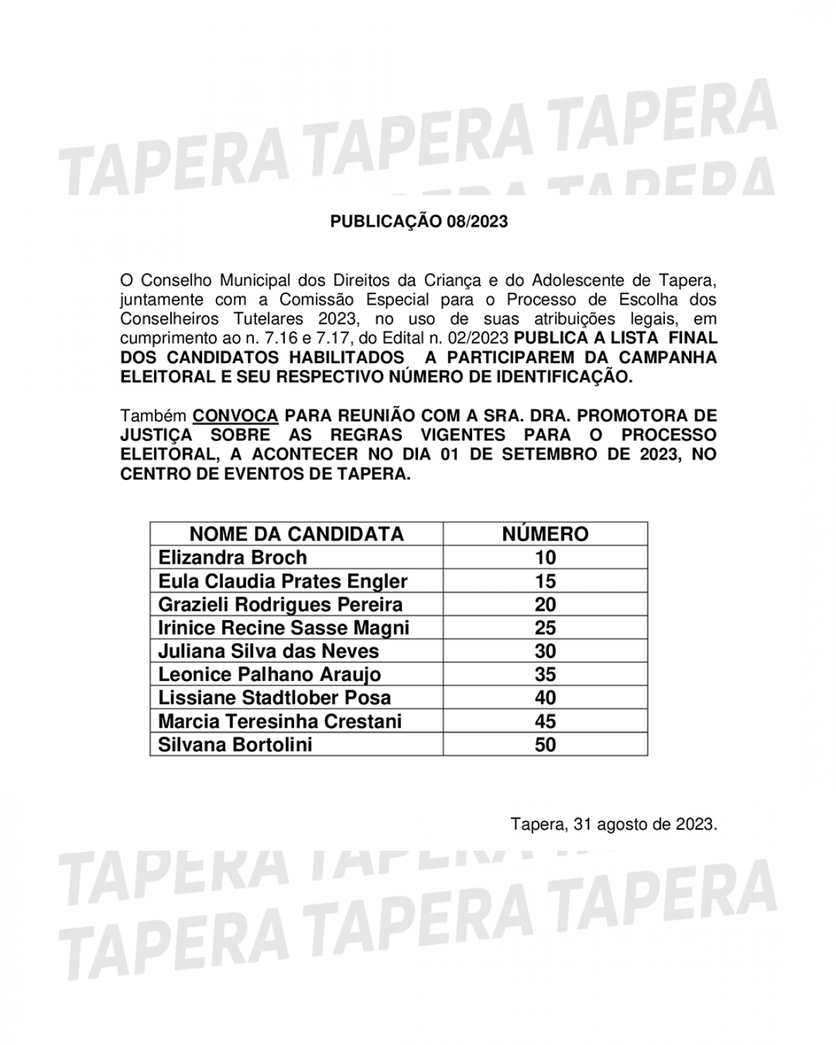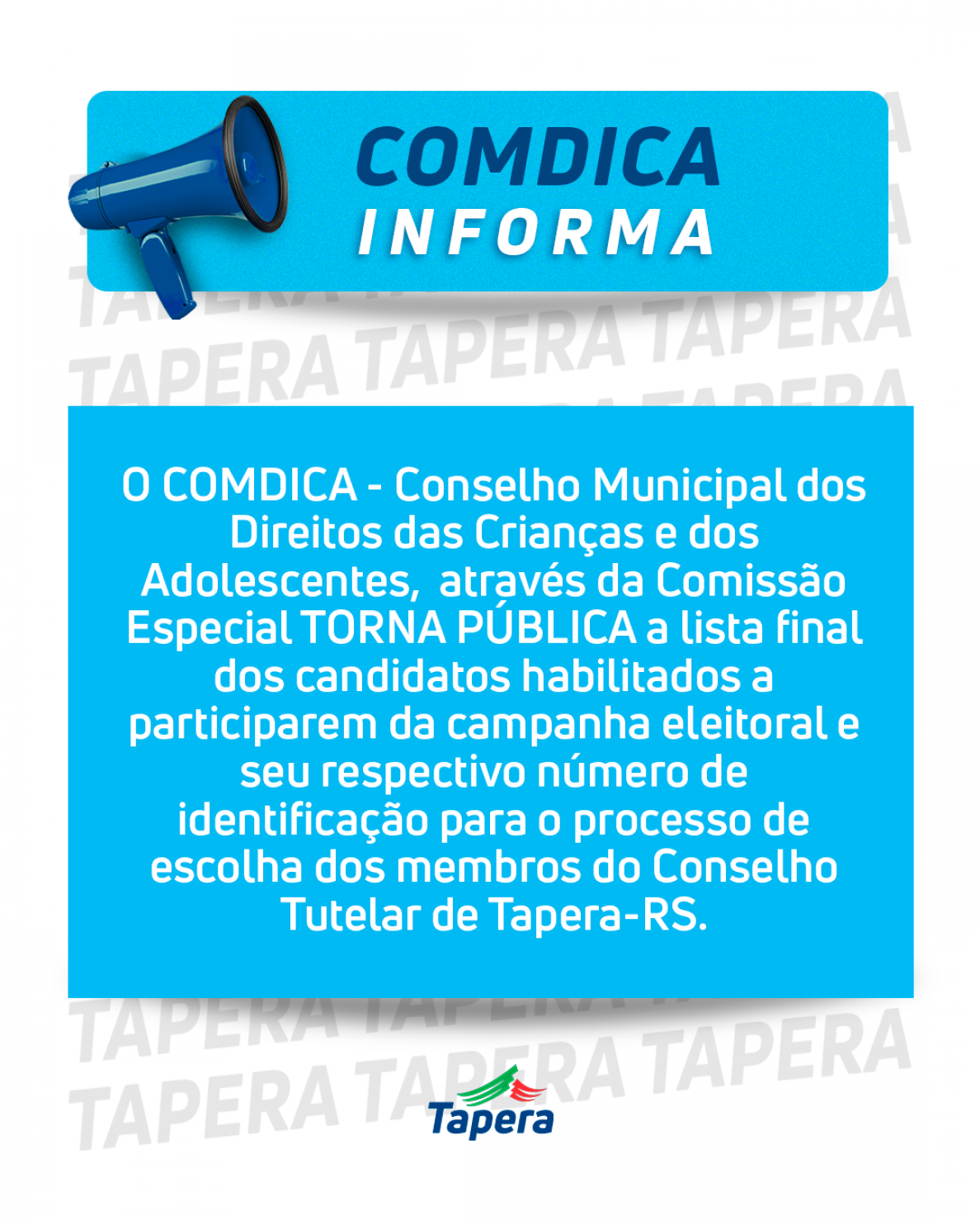 O COMDICA - Conselho Municipal dos Direitos das Crianças e dos Adolescentes, através da Comissão Especial torna pública a lista final dos candidatos habilitados a participarem da campanha eleitoral e seu respectivo número de identificação para o processo de escolha dos membros do Conselho Tutelar de Tapera-RS.