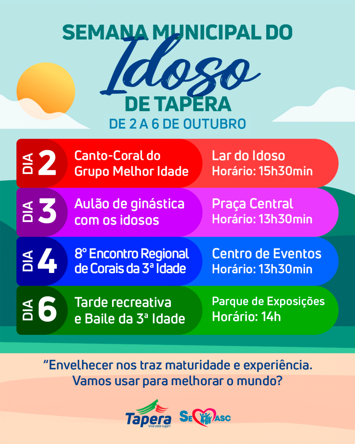 A Prefeitura Municipal de Tapera, através da Secretaria Municipal de Assistência Social e Cidadania – SEMASC e Centro de Referência de Assistência Social - CRAS, vimos convidar para prestigiar a Semana Municipal do Idoso, que acontecerá nos dias 02 a 06 de outubro.
