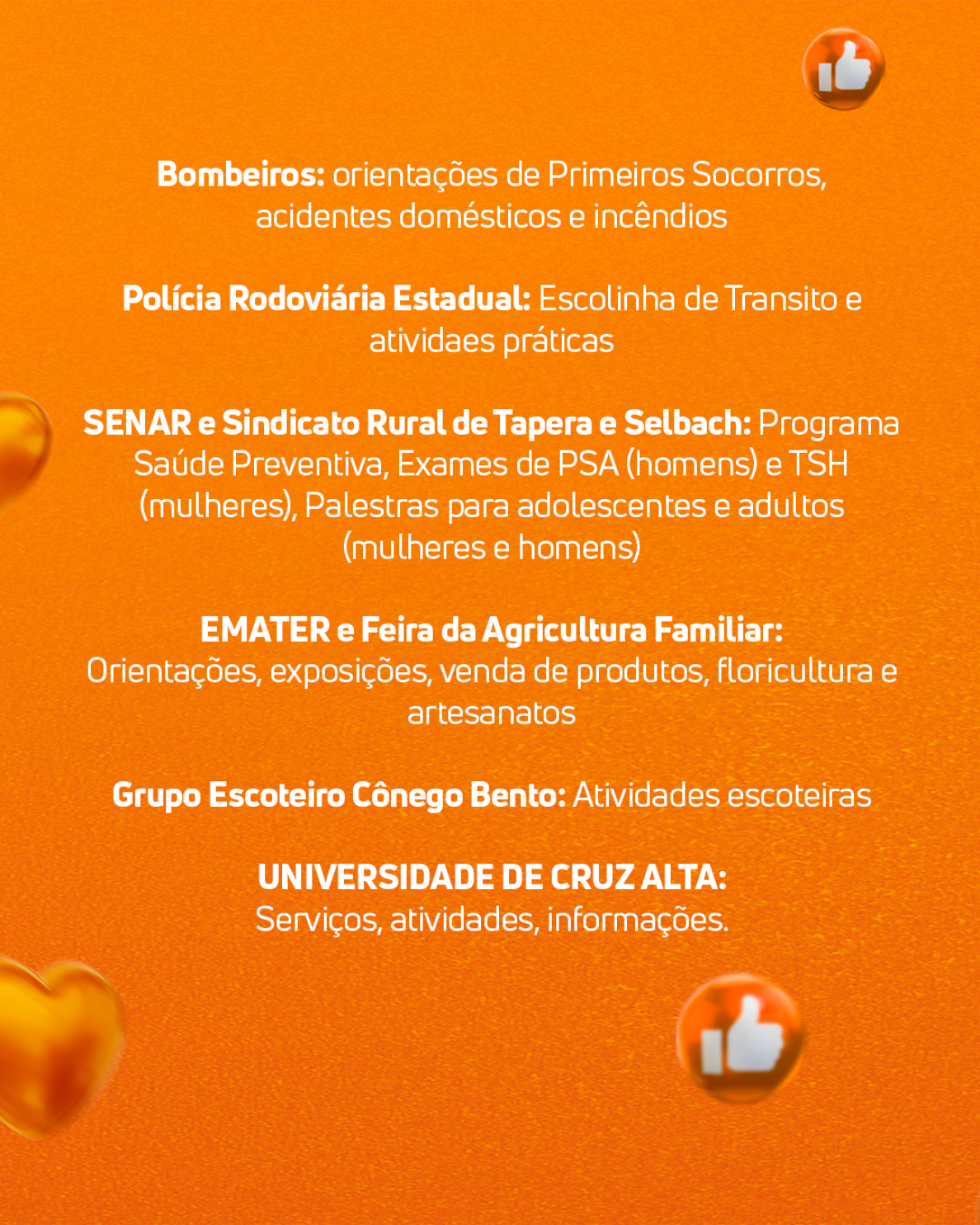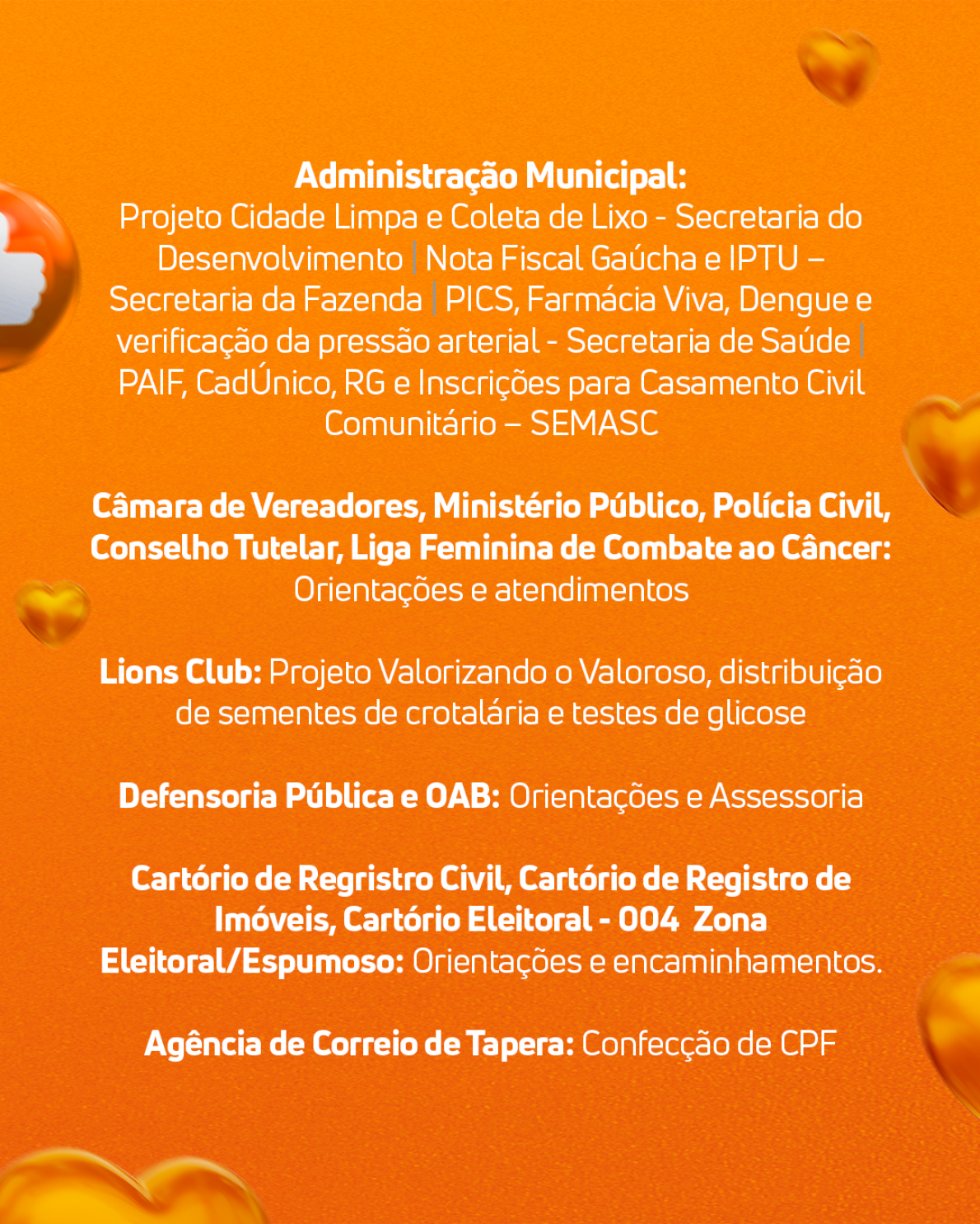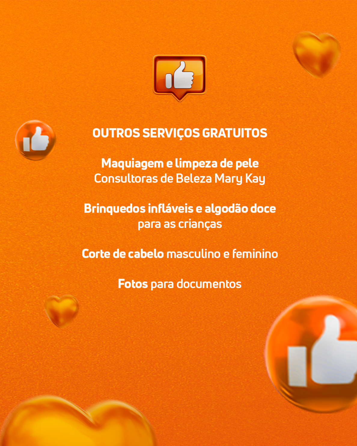 Serão diversos serviços gratuitos disponíveis para toda a comunidade taperense. Além de orientações, exames de saúde, maquiagem, limpeza de pele, corte de cabelo, foto 3x4 para documentos, brinquedos e algodão doce para crianças.