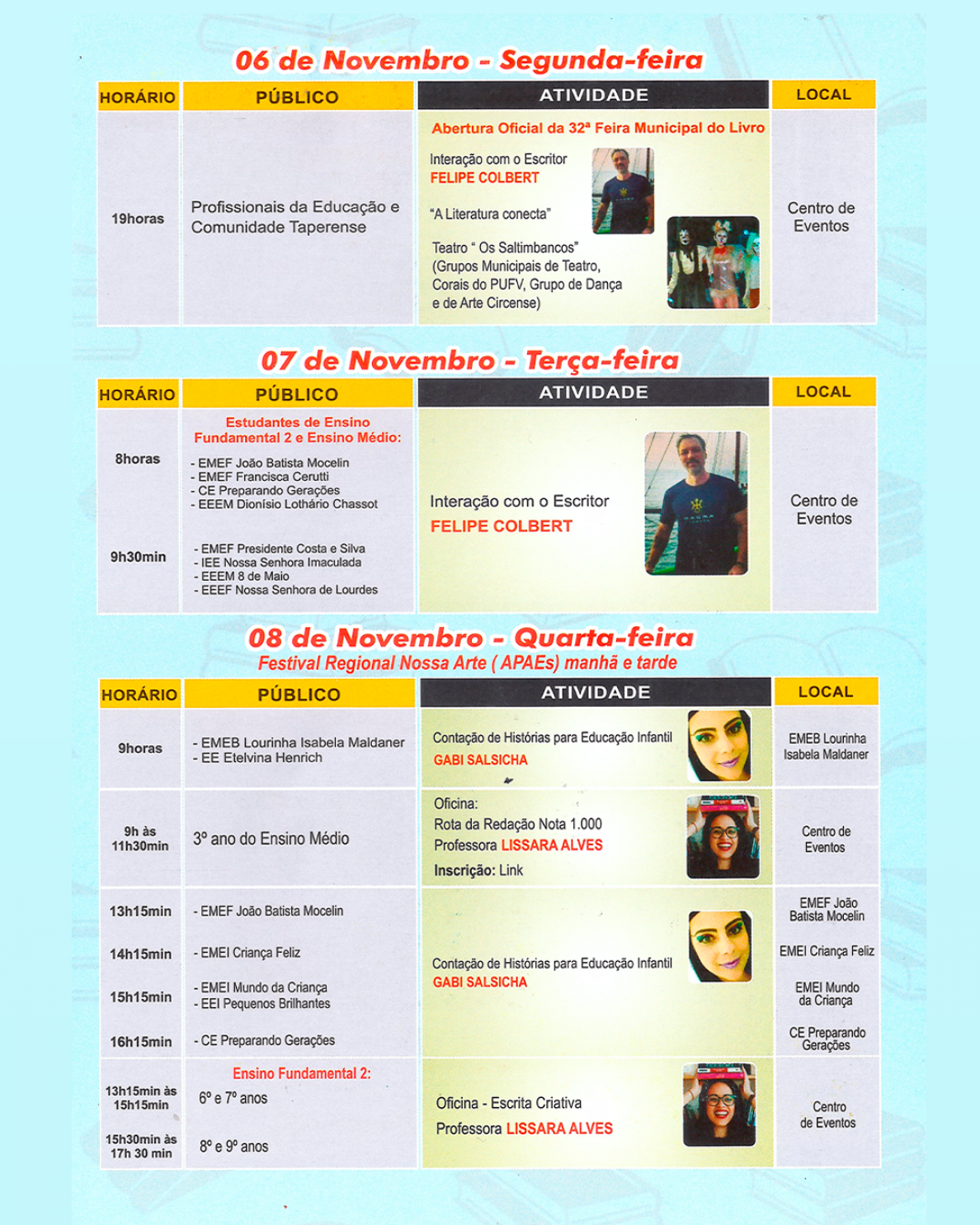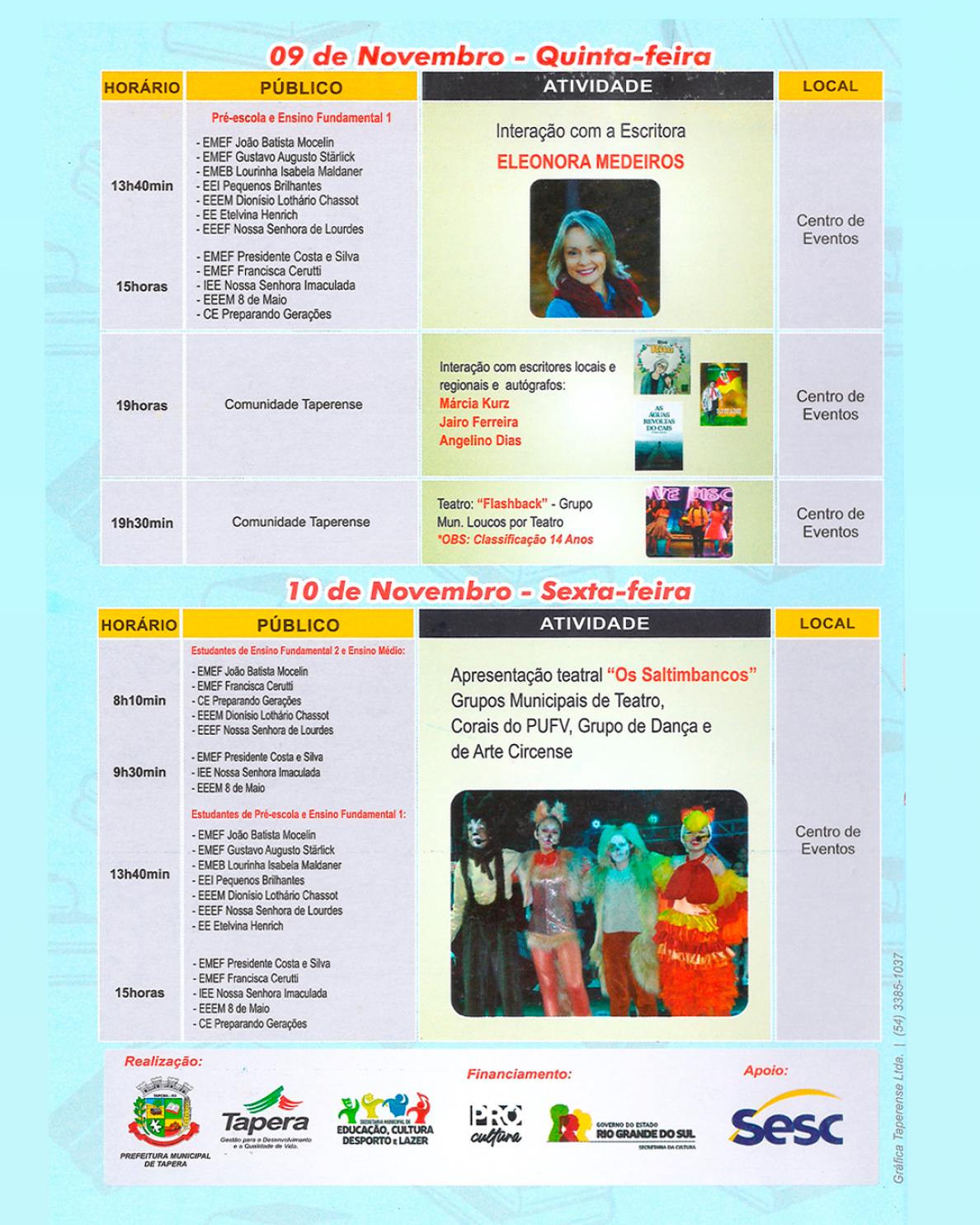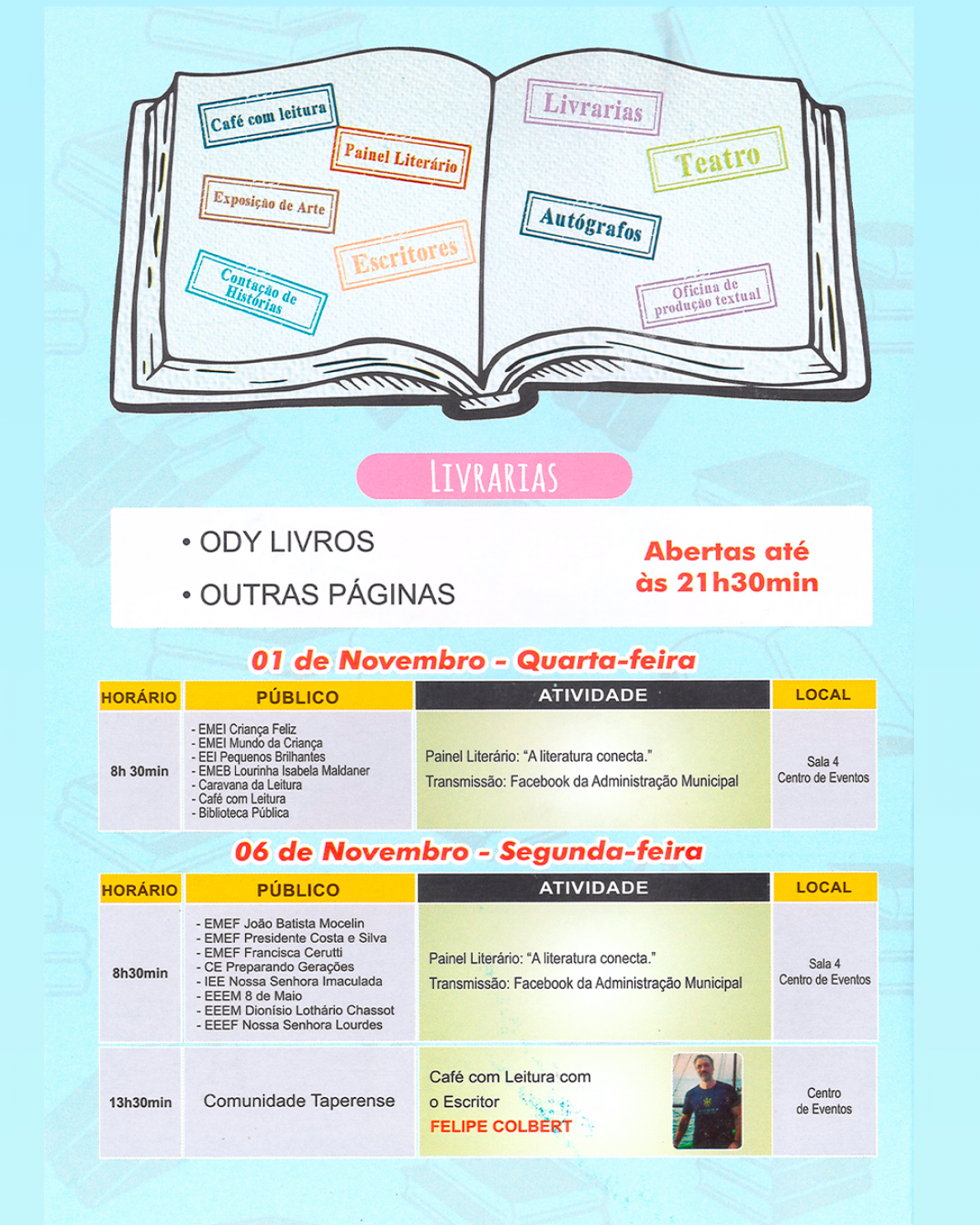 De 6 a 10 de Novembro, Tapera te espera para visitar e participar da tradicional Feira do Livro. Serão diversas atividades e apresentações, confira a programação.