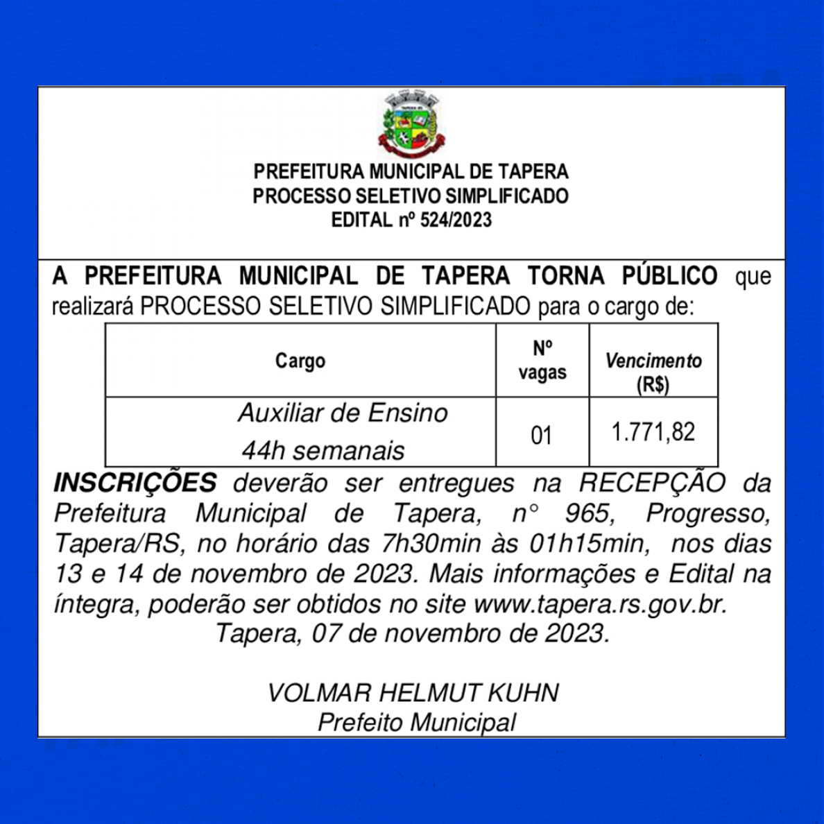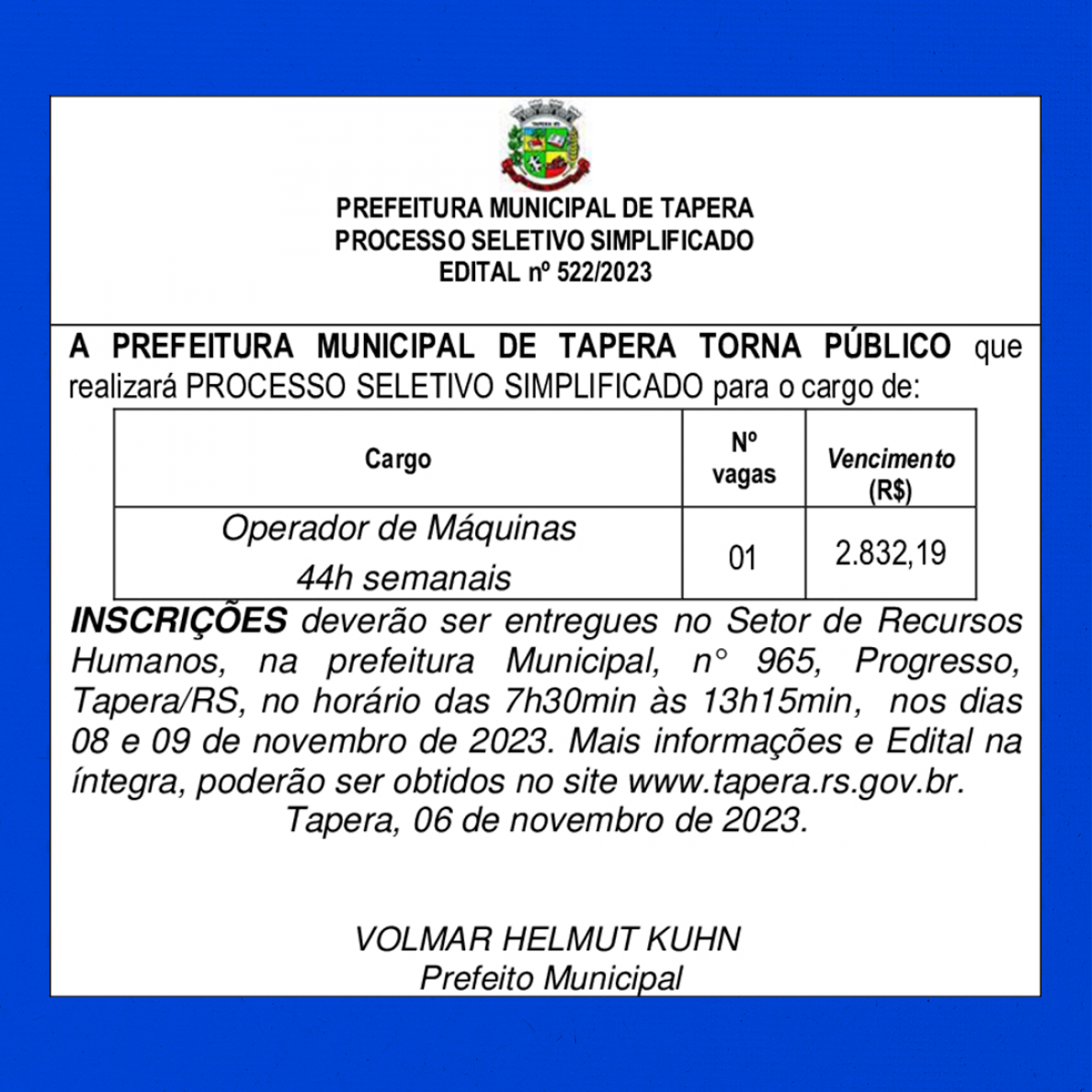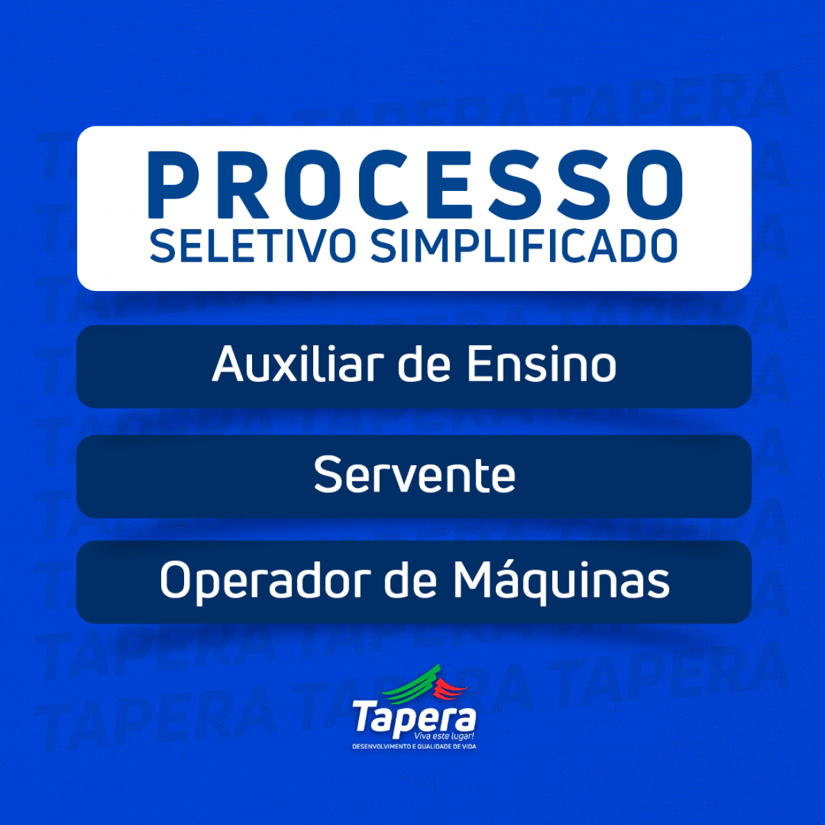 Abertas as inscrições para os processos seletivos simplificados de Servente e Operador de Máquinas.Para mais informações, acesse o link: https://www.tapera.rs.gov.br/pg.php?area=PROCESSOSELETIVO&ano=2023