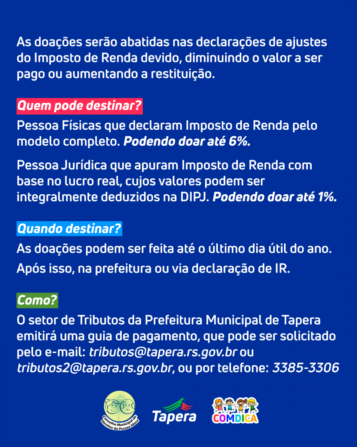 Doe parte do Imposto de Renda Devido para o Fundo Municipal da Criança e do Adolescente ou para o Fundo Municipal do Idoso de Tapera. As doações podem ser feitas até o último dia útil do ano, participe!