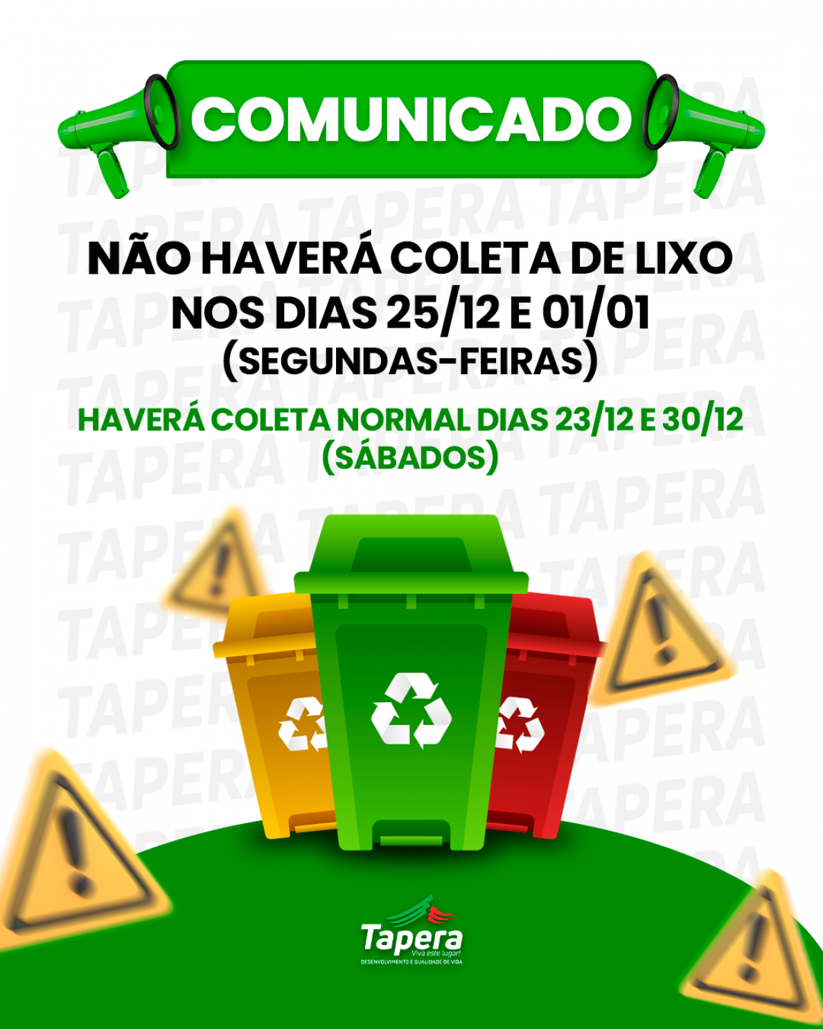 NÃO haverá coleta de lixo nos dias 25/12 e 01/01 (segundas-feiras). Haverá coleta normal dias 23/12 e 30/12 (sábados).