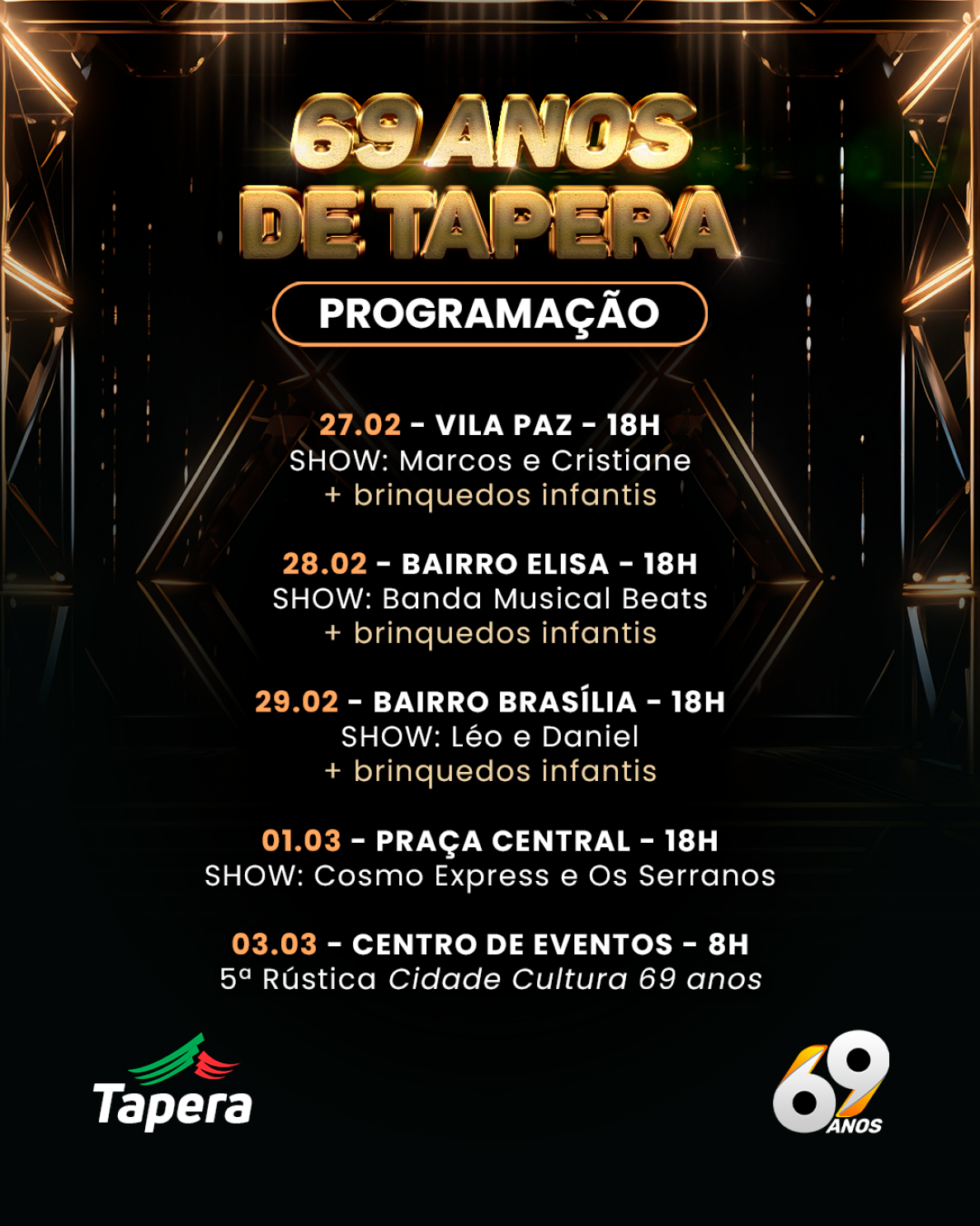 Para comemorar os 69 anos da nossa querida Tapera, a Administração Municipal preparou uma programação especial para todos os taperenses. Dia 01 de março, sexta-feira, grande show com Os Serranos e logo após, Banda Cosmos Express, será um dia de muita alegria.