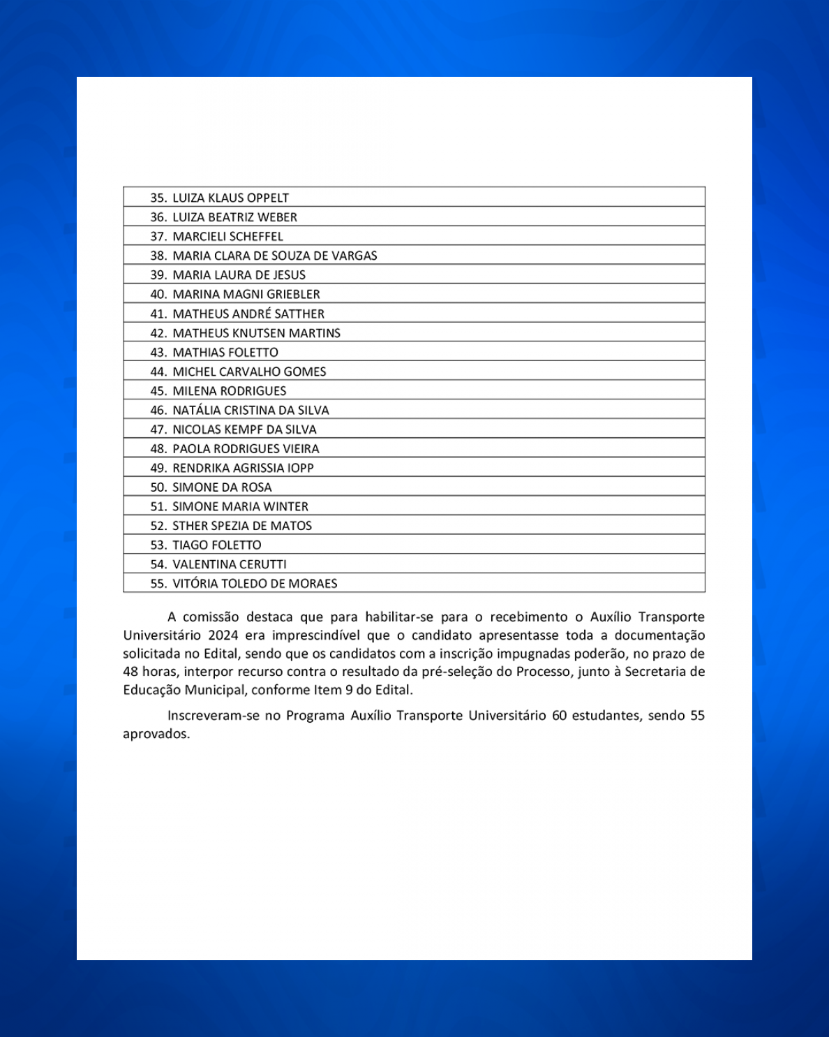 Resultado das inscrições do Auxílio Transporte Universitário, programa oferecido pelo município para beneficiar estudantes que residem em tapera e estudam em outra cidade.