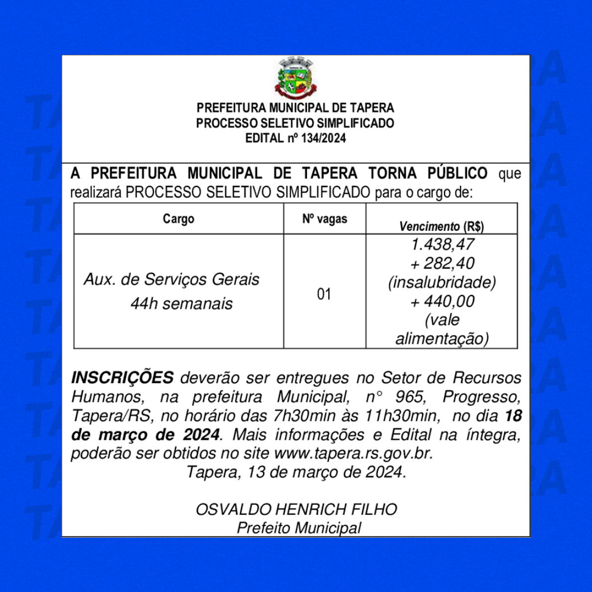 No dia 18 de março, estarão abertas as inscrições para o Processo Seletivo Simplificado de Auxiliar de Serviços Gerais. Para mais informações, acesse o site da Prefeitura na aba "Concursos/Processos Seletivos".