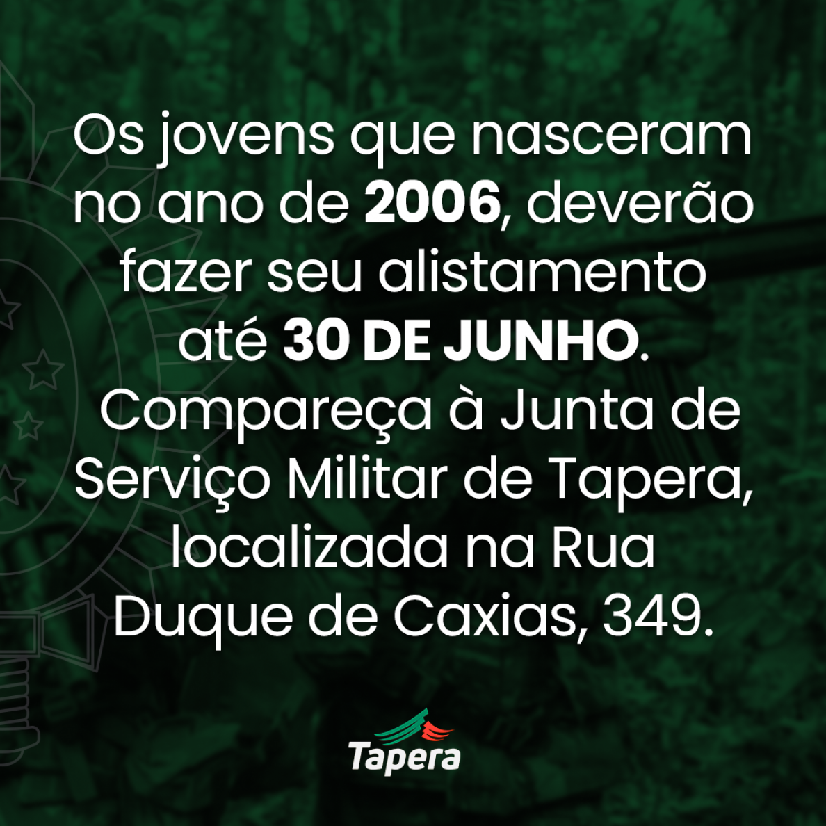 Os jovens que nasceram no ano de 2006, deverão fazer seu alistamento até 30 DE JUNHO. Compareça à Junta de Serviço Militar de Tapera, localizada na Rua Duque de Caxias, 349, ao lado da EMATER.