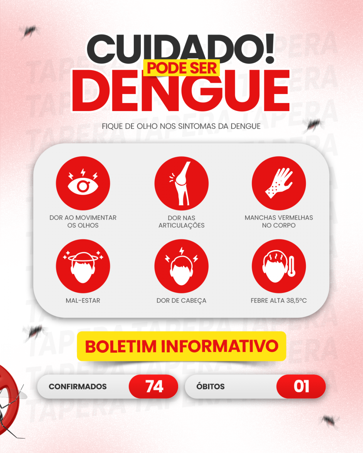 Vamos juntos combater o mosquito da Dengue? Cada um deve fazer a sua parte, evitando água parada e consequentemente a proliferação do mosquito. As Agentes de Saúde do município, já estão realizando as visitas nos bairros, orientando os moradores e fiscalizando possíveis focos do mosquito da Dengue. Alguns cuidados que podem ajudar: coloque areia no prato das plantas, embale ou descarte objetos que acumulem água, seque áreas que acumulem água, mantenha a caixa d’água tampada e as calhas limpas.