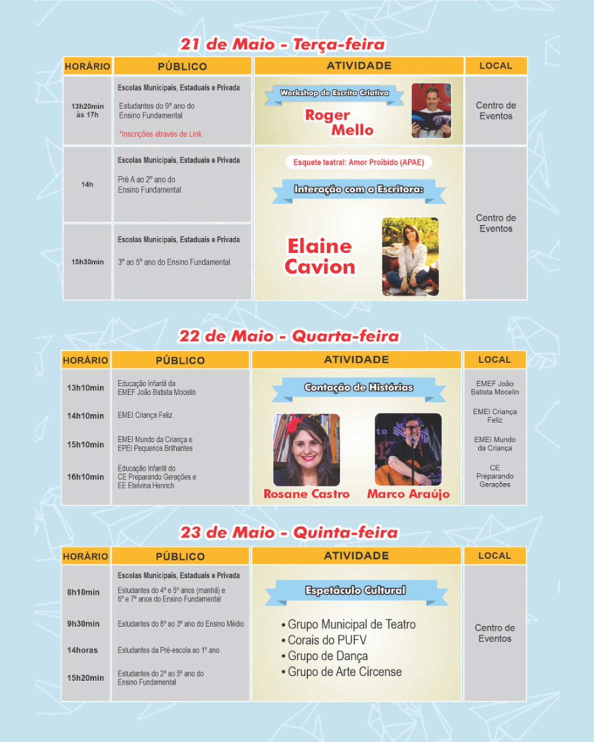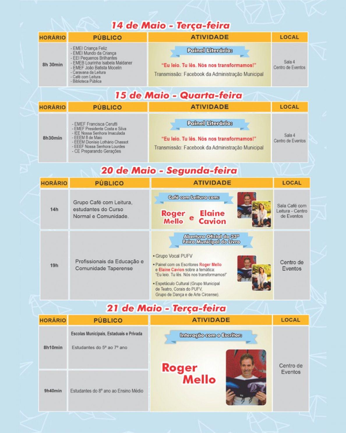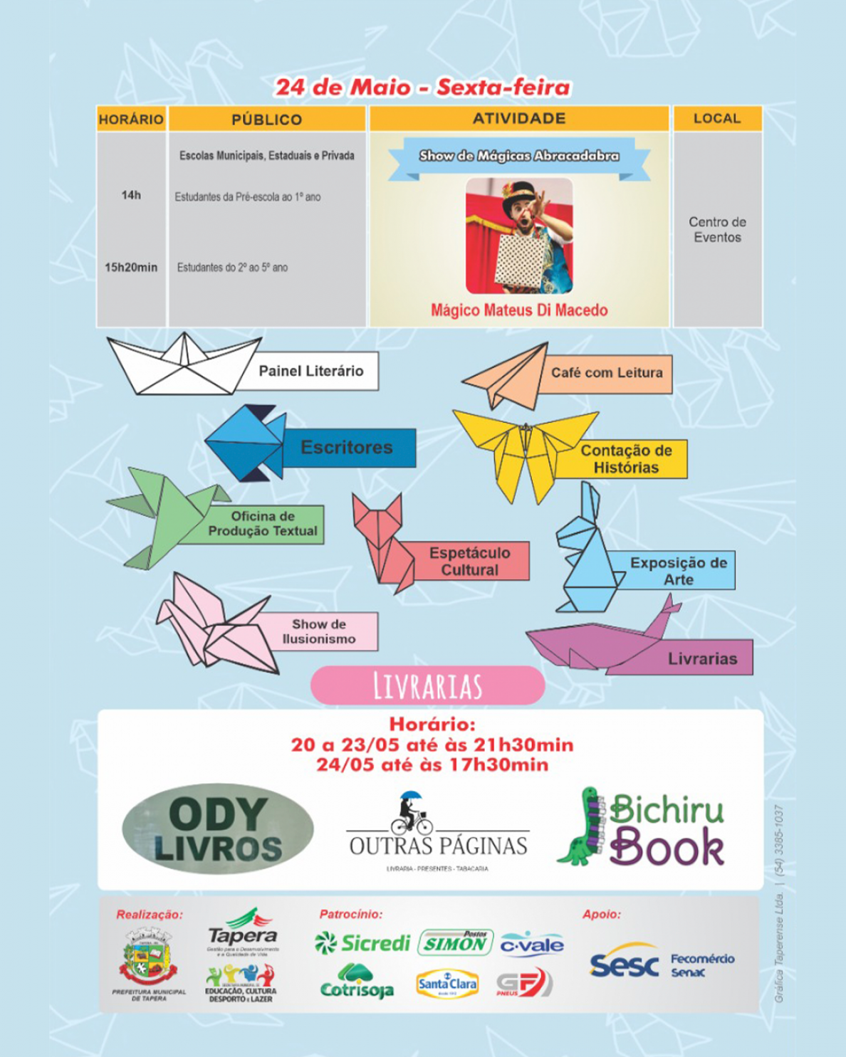 Vem aí a 33ª Feira do Livro de Tapera, de 14 a 24 de Maio, no Centro de Eventos. Haverá diversas atividades, apresentações, painéis literários e muito mais, prestigie!