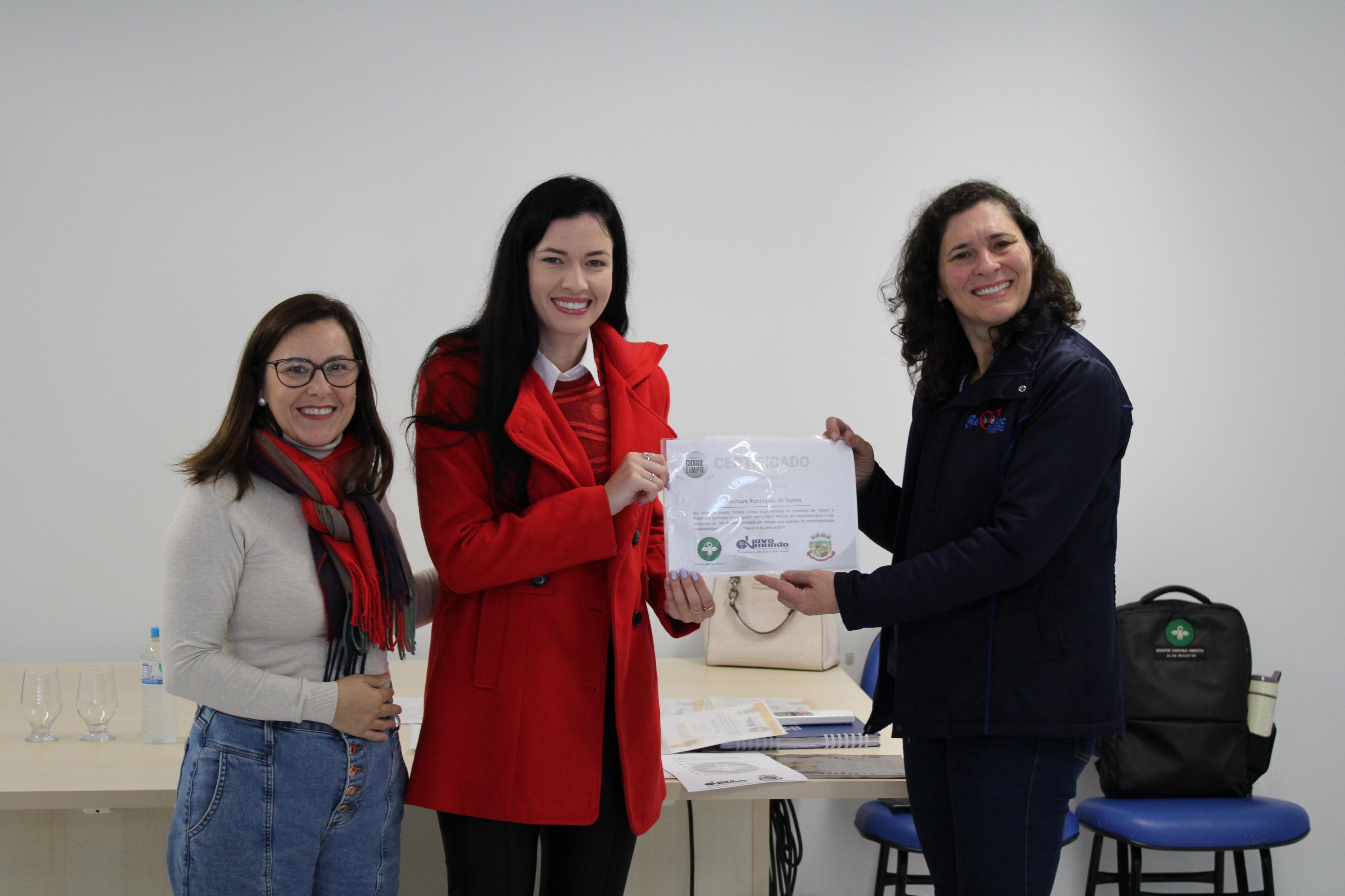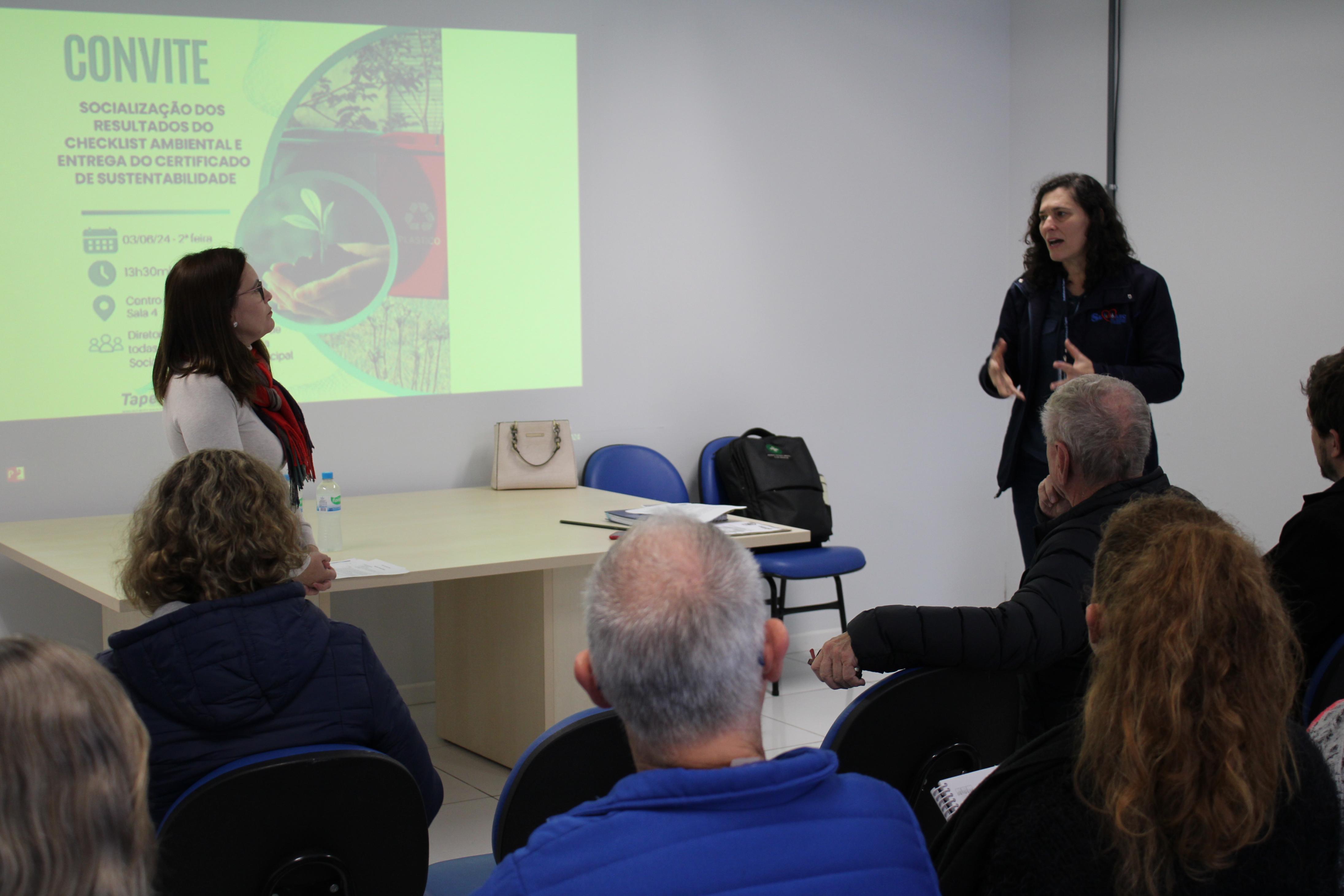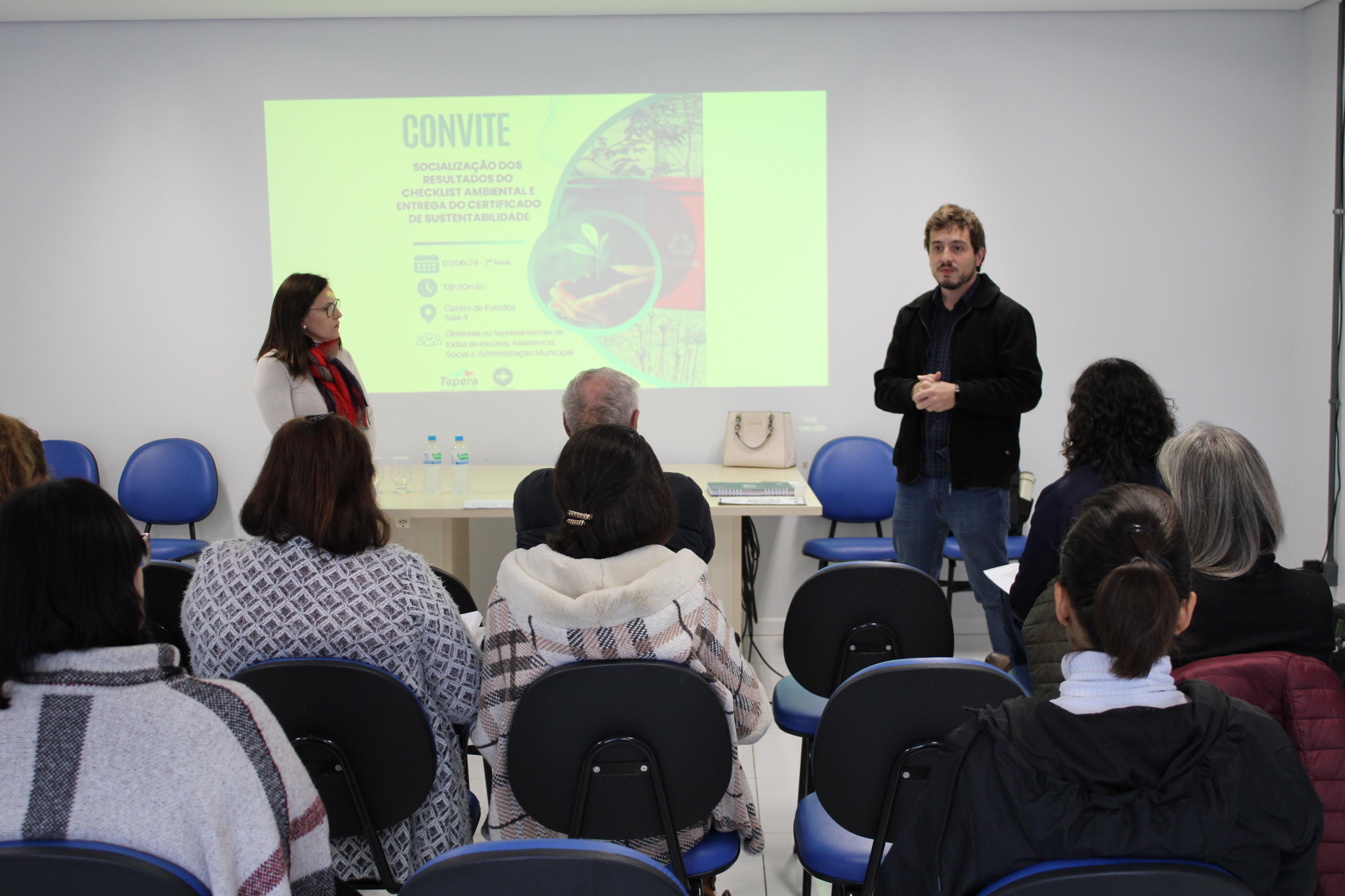 Na tarde de ontem, 03/06, aconteceu na Sala de Reuniões do Centro de Eventos uma socialização dos resultados do checklist ambiental e a entrega de certificados de sustentabilidade. A Engenheira Ambiental, Elisa Schuster, iniciou apresentando pontos positivos e negativos encontrados no município quanto a sustentabilidade, em seguida, os resultados da vistoria ambiental realizado nas escolas e espaços públicos, por fim, a entrega dos certificados ambientais aos diretores das escolas, com selos de bronze, prata e ouro. Estavam presentes no encontro, o Prefeito, Osvaldo Henrich Filho, Chefe de Gabinete, Elias Goulart, Secretária de Educação, Lucimara Karpe Canova, Secretária de Assistência Social e Cidadania, Miriam Saggin Visoto, e diretores das escolas do município. No segundo encontro da tarde, ocorreu uma capacitação sobre separação e descarte de resíduos, com a participação das auxiliares de serviços gerias, merendeiras e funcionários públicos.