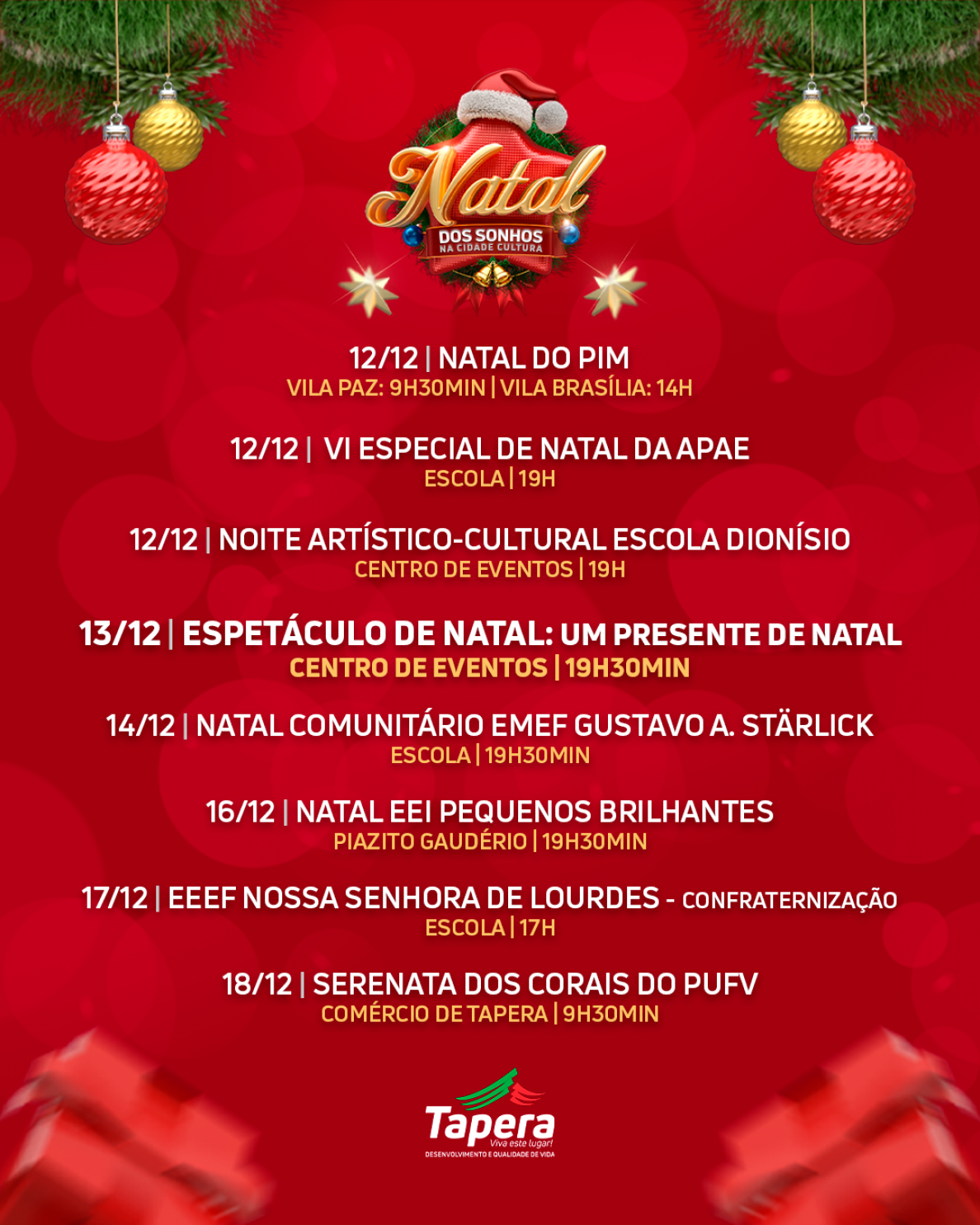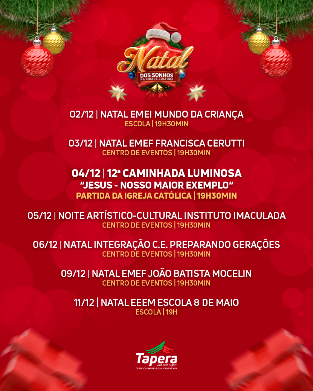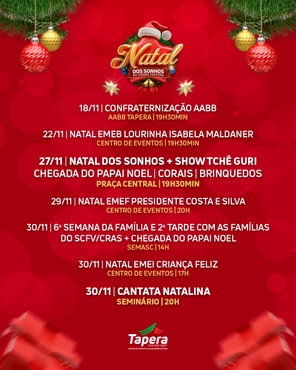 Prestigie a magia do Natal da nossa cidade, serão diversos dias com atrações e eventos durante ainda o mês de novembro e todo o mês de dezembro.